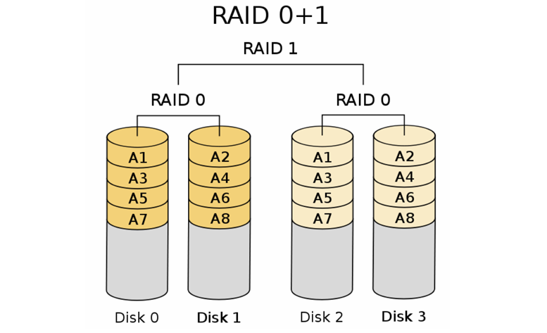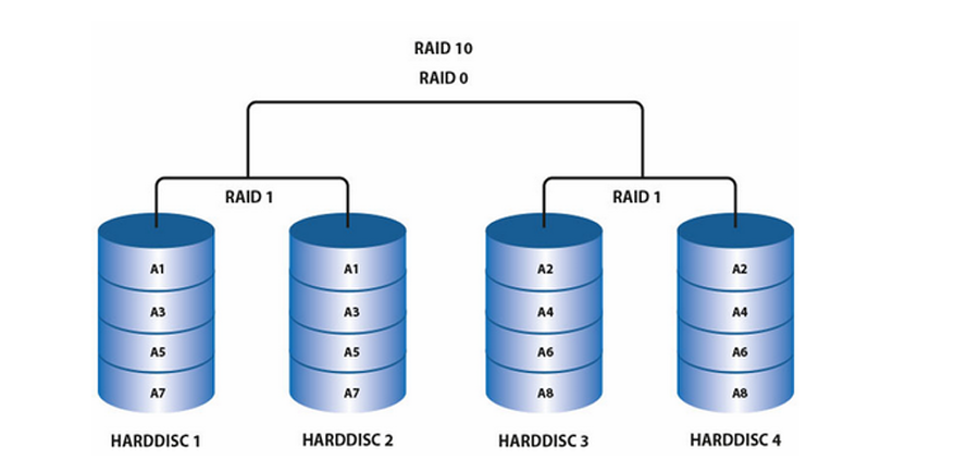 此模式具有RAID 1 和RAID 0的所有优点,其首先用RAID 1将磁盘分为 2份,实现了数据备份的能力,且会在写数据时发给多个RAID 1模式,从而也提升了写数据的能力,至少4块硬盘组成允许同一镜像组外多块磁盘损坏