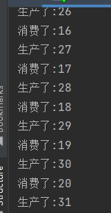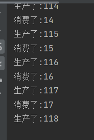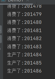 import java.util.concurrent.BlockingQueue;public class Demo1 {public static void main(String[] args) {//阻塞队列BlockingQueue<Integer> queue = new ArrayBlockingQueue<Integer>(100);//生产者Thread t1 = new Thread(()->{int n = 0;while (true){System.out.println("生产了:" + n);try {queue.put(n);} catch (InterruptedException e) {throw new RuntimeException(e);}n++;}});//消费者Thread t2 = new Thread(()->{while ( true){try {int n = queue.take();System.out.println("消费了:" + n);} catch (InterruptedException e) {throw new RuntimeException(e);}}});t1.start();t2.start();}