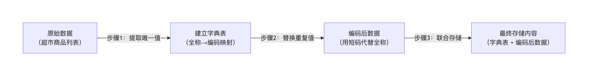 字典编码本质是 “建立映射→替换数据→存储映射 + 编码” 的过程,结合超市场景的原理流程图如下: