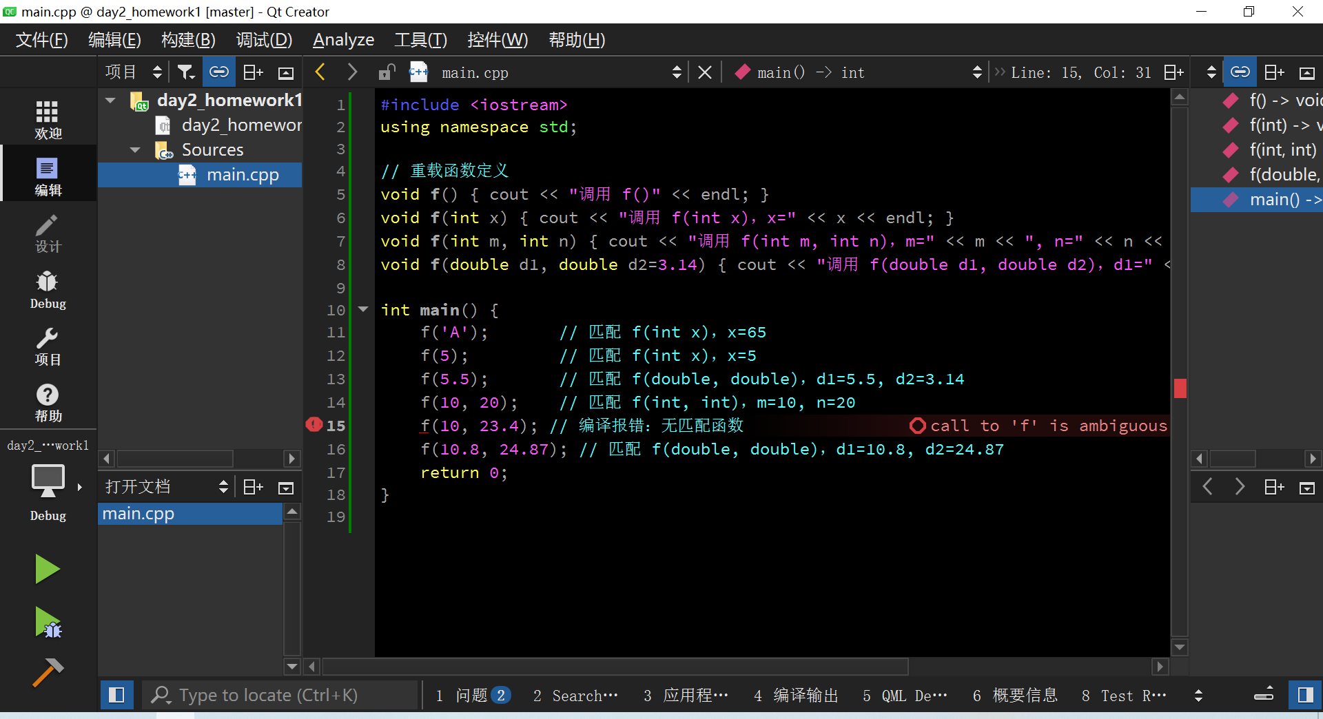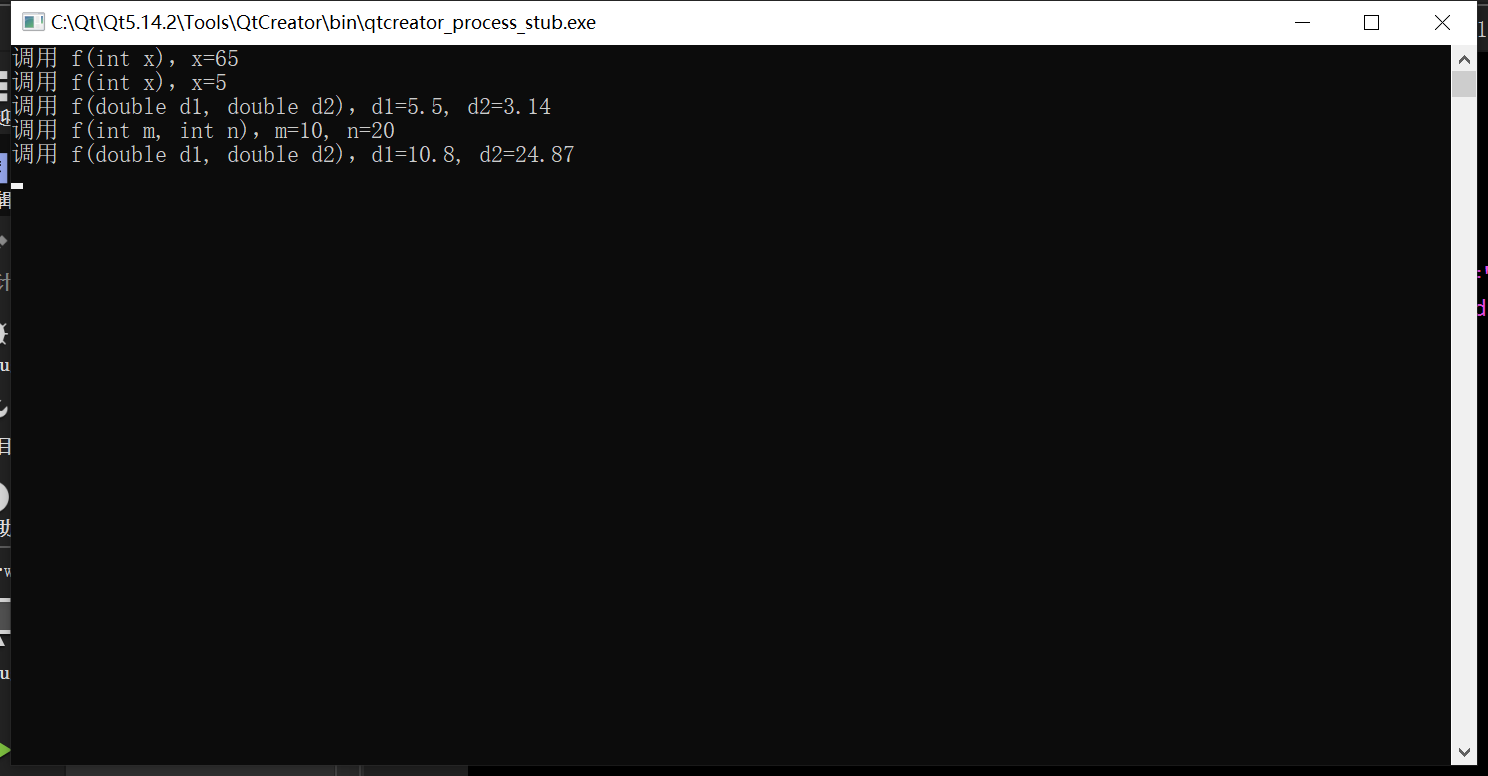 void f(double d1, double d2=3.14) { cout << "调用 f(double d1, double d2),d1=" << d1 << ", d2=" << d2 << endl; }int main() {f('A'); // 匹配 f(int x),x=65f(5); // 匹配 f(int x),x=5f(5.5); // 匹配 f(double, double),d1=5.5, d2=3.14f(10, 20); // 匹配 f(int, int),m=10, n=20//f(10, 23.4); // 编译报错:无匹配函数f(10.8, 24.87); // 匹配 f(double, double),d1=10.8, d2=24.87return 0;