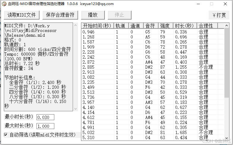 血玥珏-MIDI音符合理性筛选处理器是一款专门用于处理和分析MIDI音乐文件的工具软件。它能够读取标准MIDI文件,对音符进行可视化展示、合理性筛选、重叠处理、音符编辑等操作,帮助音乐制作者、编曲爱好者和音乐教育工作者更好地管理和优化MIDI音符数据。