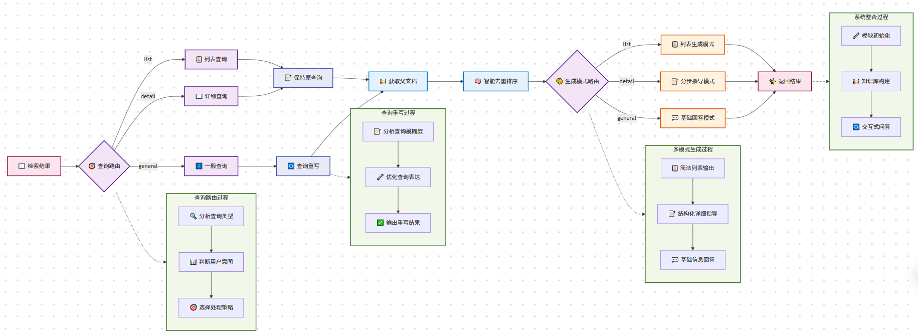 - "红烧肉需要什么食材" → "红烧肉需要什么食材"(保持原查询)请输出最终查询(如果不需要重写就返回原查询):""",input_variables=["query"])chain = ({"query": RunnablePassthrough()}| prompt| self.llm| StrOutputParser())response = chain.invoke(query).strip()# 记录重写结果if response != query:logger.info(f"查询已重写: '{query}' → '{response}'")else:logger.info(f"查询无需重写: '{query}'")return responsedef query_router(self, query: str) -> str:"""查询路由 - 根据查询类型选择不同的处理方式Args:query: 用户查询Returns:路由类型 ('list', 'detail', 'general')"""prompt = ChatPromptTemplate.from_template("""