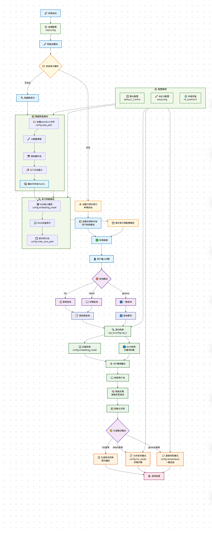 logger = logging.getLogger(__name__)class RecipeRAGSystem:"""食谱RAG系统主类"""def __init__(self, config: RAGConfig = None):"""初始化RAG系统Args:config: RAG系统配置,默认使用DEFAULT_CONFIG"""self.config = config or DEFAULT_CONFIGself.data_module = Noneself.index_module = Noneself.retrieval_module = Noneself.generation_module = None# 检查数据路径if not Path(self.config.data_path).exists():raise FileNotFoundError(f"数据路径不存在: {self.config.data_path}")# 检查API密钥if not os.getenv("MOONSHOT_API_KEY"):raise ValueError("请设置 MOONSHOT_API_KEY 环境变量")def initialize_system(self):"""初始化所有模块"""print("🚀 正在初始化RAG系统...")# 1. 初始化数据准备模块print("初始化数据准备模块...")self.data_module = DataPreparationModule(self.config.data_path)# 2. 初始化索引构建模块print("初始化索引构建模块...")self.index_module = IndexConstructionModule(model_name=self.config.embedding_model,index_save_path=self.config.index_save_path)# 3. 初始化生成集成模块print("🤖 初始化生成集成模块...")self.generation_module = GenerationIntegrationModule(model_name=self.config.llm_model,temperature=self.config.temperature,max_tokens=self.config.max_tokens)print("✅ 系统初始化完成!")def build_knowledge_base(self):"""构建知识库"""print("\n正在构建知识库...")# 1. 尝试加载已保存的索引vectorstore = self.index_module.load_index()if vectorstore is not None:print("✅ 成功加载已保存的向量索引!")# 仍需要加载文档和分块用于检索模块print("加载食谱文档...")self.data_module.load_documents()print("进行文本分块...")chunks = self.data_module.chunk_documents()else:print("未找到已保存的索引,开始构建新索引...")# 2. 加载文档print("加载食谱文档...")self.data_module.load_documents()# 3. 文本分块print("进行文本分块...")chunks = self.data_module.chunk_documents()# 4. 构建向量索引print("构建向量索引...")vectorstore = self.index_module.build_vector_index(chunks)# 5. 保存索引print("保存向量索引...")self.index_module.save_index()# 6. 初始化检索优化模块print("初始化检索优化...")self.retrieval_module = RetrievalOptimizationModule(vectorstore, chunks)# 7. 显示统计信息stats = self.data_module.get_statistics()print(f"\n📊 知识库统计:")print(f" 文档总数: {stats['total_documents']}")print(f" 文本块数: {stats['total_chunks']}")print(f" 菜品分类: {list(stats['categories'].keys())}")print(f" 难度分布: {stats['difficulties']}")print("✅ 知识库构建完成!")def ask_question(self, question: str, stream: bool = False):"""回答用户问题Args:question: 用户问题stream: 是否使用流式输出Returns:生成的回答或生成器"""if not all([self.retrieval_module, self.generation_module]):raise ValueError("请先构建知识库")print(f"\n❓ 用户问题: {question}")# 1. 查询路由route_type = self.generation_module.query_router(question)print(f"🎯 查询类型: {route_type}")# 2. 智能查询重写(根据路由类型)if route_type == 'list':# 列表查询保持原查询rewritten_query = questionprint(f"📝 列表查询保持原样: {question}")else:# 详细查询和一般查询使用智能重写print("🤖 智能分析查询...")rewritten_query = self.generation_module.query_rewrite(question)# 3. 检索相关子块(自动应用元数据过滤)print("🔍 检索相关文档...")filters = self._extract_filters_from_query(question)if filters:print(f"应用过滤条件: {filters}")relevant_chunks = self.retrieval_module.metadata_filtered_search(rewritten_query, filters, top_k=self.config.top_k)else:relevant_chunks = self.retrieval_module.hybrid_search(rewritten_query, top_k=self.config.top_k)# 显示检索到的子块信息if relevant_chunks:chunk_info = []for chunk in relevant_chunks:dish_name = chunk.metadata.get('dish_name', '未知菜品')# 尝试从内容中提取章节标题content_preview = chunk.page_content[:50].replace('\n', ' ').strip()if content_preview.startswith('#'):# 如果是标题开头,提取标题title_end = content_preview.find('\n') if '\n' in chunk.page_content[:100] else len(content_preview)section_title = chunk.page_content[:title_end].strip('#').strip()chunk_info.append(f"{dish_name}({section_title})")else:chunk_info.append(f"{dish_name}(内容片段)")print(f"找到 {len(relevant_chunks)} 个相关文档块: {', '.join(chunk_info)}")else:print(f"找到 {len(relevant_chunks)} 个相关文档块")# 4. 检查是否找到相关内容if not relevant_chunks:return "抱歉,没有找到相关的食谱信息。请尝试其他菜品名称或关键词。"# 5. 根据路由类型选择回答方式if route_type == 'list':# 列表查询:直接返回菜品名称列表print("📋 生成菜品列表...")relevant_docs = self.data_module.get_parent_documents(relevant_chunks)# 显示找到的文档名称doc_names = []for doc in relevant_docs:dish_name = doc.metadata.get('dish_name', '未知菜品')doc_names.append(dish_name)if doc_names:print(f"找到文档: {', '.join(doc_names)}")return self.generation_module.generate_list_answer(question, relevant_docs)else:# 详细查询:获取完整文档并生成详细回答print("获取完整文档...")relevant_docs = self.data_module.get_parent_documents(relevant_chunks)# 显示找到的文档名称doc_names = []for doc in relevant_docs:dish_name = doc.metadata.get('dish_name', '未知菜品')doc_names.append(dish_name)if doc_names:print(f"找到文档: {', '.join(doc_names)}")else:print(f"对应 {len(relevant_docs)} 个完整文档")print("✍️ 生成详细回答...")# 根据路由类型自动选择回答模式if route_type == "detail":# 详细查询使用分步指导模式if stream:return self.generation_module.generate_step_by_step_answer_stream(question, relevant_docs)else:return self.generation_module.generate_step_by_step_answer(question, relevant_docs)else:# 一般查询使用基础回答模式if stream:r
