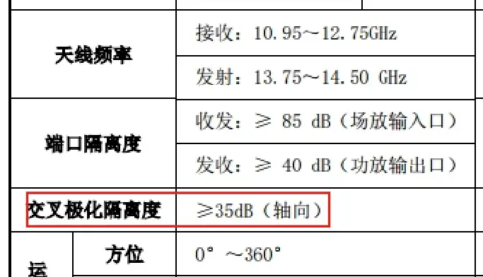 国内某2.4m静中通Ku频段天线的交叉极化隔离度指标是35dB: