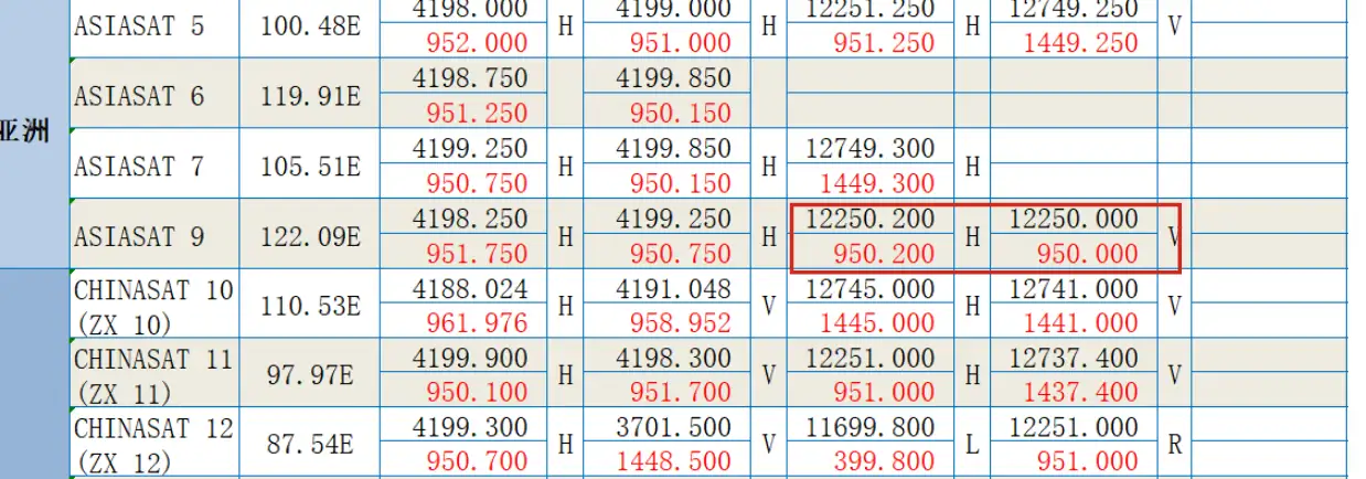 比如下图中亚洲9号卫星的信标:在12.25GHz的频率上有一个水平极化H的信标,同时也有一个垂直极化V的信标。中星10号卫星在12.745GHz上有水平极化信标,在靠近的频率12.741GHz上有垂直极化信标。