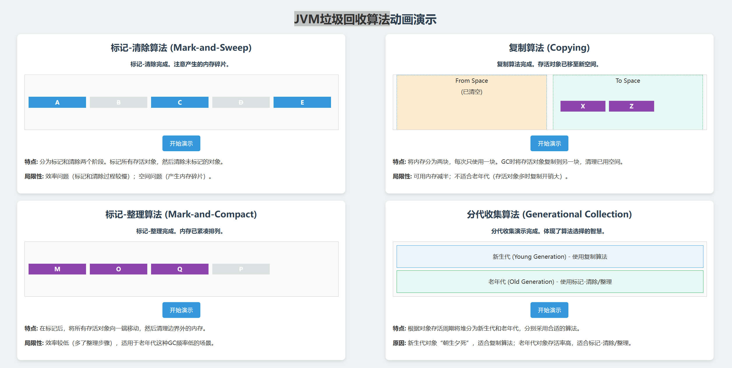 <head><meta charset="UTF-8"><meta name="viewport" content="width=device-width, initial-scale=1.0"><title>JVM垃圾回收算法详细动画演示</title><style>body {font-family: "Microsoft YaHei", sans-serif;background-color: #eef2f3;margin: 0;padding: 20px;color: #333;}h1 {text-align: center;color: #2c3e50;}.container {display: flex;flex-wrap: wrap;justify-content: space-around;gap: 20px;}.algorithm-section {background-color: #ffffff;border-radius: 10px;box-shadow: 0 4px 8px rgba(0,0,0,0.1);padding: 20px;width: 45%;min-width: 550px;box-sizing: border-box;}.algorithm-title {text-align: center;margin-top: 0;color: #2c3e50;}.animation-area {width: 100%;height: 200px;border: 1px solid #ccc;position: relative;overflow: hidden;margin-bottom: 15px;background-color: #fafafa;}.memory-block {position: absolute;height: 30px;top: 80px;display: flex;align-items: center;justify-content: center;font-weight: bold;color: white;transition: all 0.5s ease;}.object-alive { background-color: #27ae60; } /* Green */.object-dead { background-color: #95a5a6; } /* Gray */.object-marked { background-color: #3498db; } /* Blue */.object-moved { background-color: #8e44ad; } /* Purple */.object-copied { background-color: #f39c12; } /* Orange */.memory-region {position: absolute;height: 60px;top: 70px;display: flex;align-items: center;justify-content: center;font-weight: bold;color: #2c3e50;border: 1px dashed;}.region-from { border-color: #3498db; background-color: #ebf5fb; }.region-to { border-color: #27ae60; background-color: #e8f8f5; }.region-young { border-color: #3498db; background-color: #ebf5fb; }.region-old { border-color: #8e44ad; background-color: #f4ecf7; }.pointer {position: absolute;top: 40px;height: 10px;width: 2px;background-color: #e74c3c;transition: left 0.5s;}.phase-info {text-align: center;height: 40px;font-weight: bold;color: #2c3e50;}button {display: block;margin: 10px auto;padding: 10px 20px;background-color: #3498db;color: white;border: none;border-radius: 5px;cursor: pointer;font-size: 16px;}button:hover { background-color: #2980b9; }button:disabled { background-color: #bdc3c7; cursor: not-allowed; }.description {font-size: 16px;line-height: 1.5;}@media (max-width: 1200px) {.algorithm-section { width: 90%; }}</style>