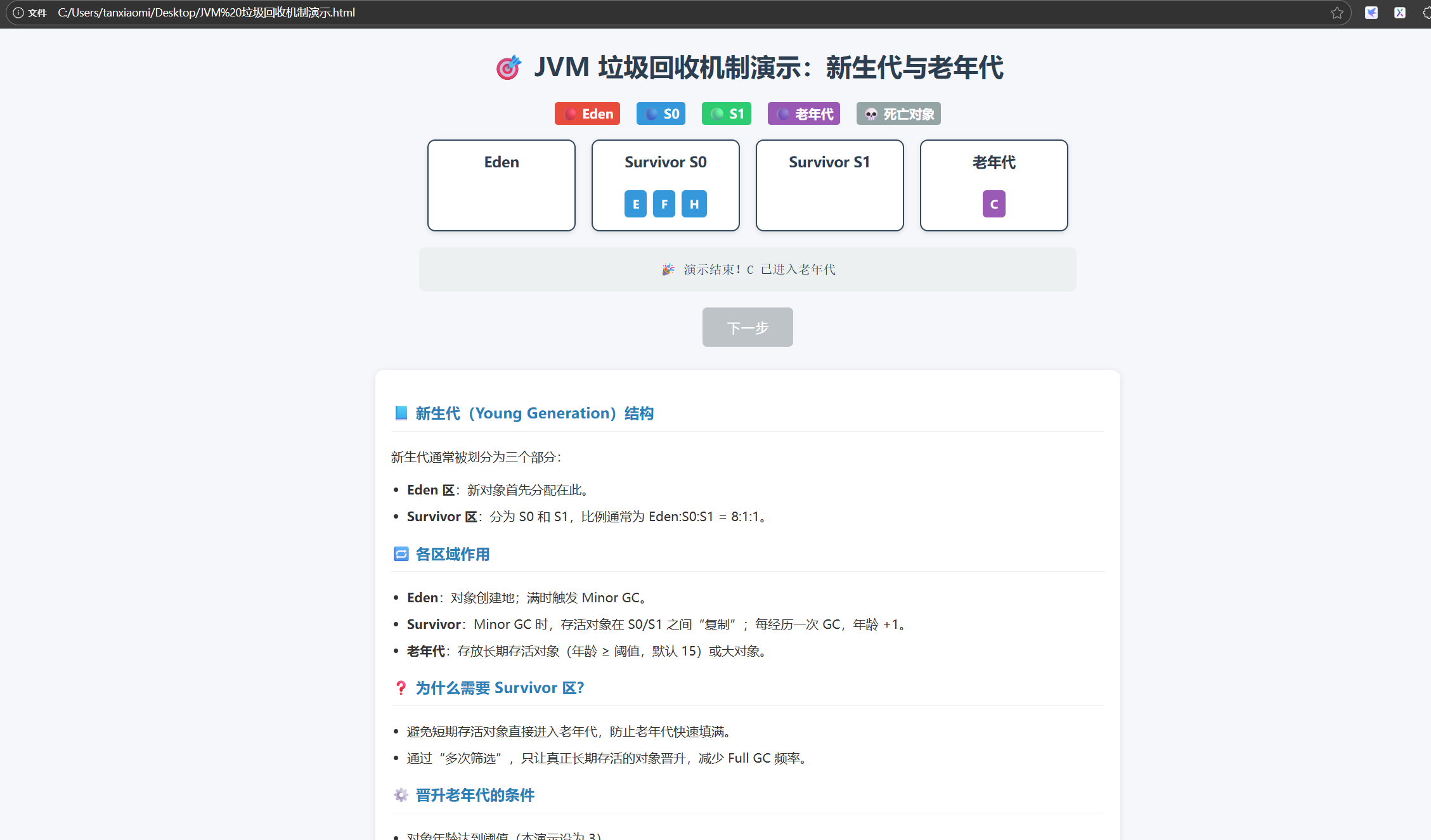 </div><script>// 初始化状态let eden = [];let s0 = [];let s1 = [];let old = [];let step = 0;const AGE_THRESHOLD = 3;function render() {const regions = { eden, s0, s1, old };for (const [name, list] of Object.entries(regions)) {const el = document.getElementById(name);if (el) {el.innerHTML = list.map(obj => `<div class="object ${!obj.alive ? 'dead' : ''}" title="年龄: ${obj.age}">${obj.name}</div>`).join('');}}}function log(msg) {const logEl = document.getElementById('log');if (logEl) logEl.innerText = msg;}function nextStep() {step++;try {switch (step) {case 1:eden = [{name:'A',age:0,alive:true}, {name:'B',age:0,alive:true}, {name:'C',age:0,alive:true}];log("✅ 创建 A、B、C → 放入 Eden(新对象首先进入 Eden)");break;case 2:if (eden.length >= 2) {eden[0].alive = false;eden[1].alive = false;}log("⏳ A、B 无引用(死亡),C 仍被引用(存活)");break;case 3:s0 = eden.filter(o => o.alive).map(o => ({...o, age: o.age + 1}));eden = [];log("♻️ Minor GC:回收 A、B;C(age=1) → S0;清空 Eden");break;case 4:eden = [{name:'D',age:0,alive:true}, {name:'E',age:0,alive:true}, {name:'F',age:0,alive:true}];log("✅ 创建 D、E、F → 放入 Eden");break;case 5:if (eden.length >= 1) eden[0].alive = false;log("⏳ D 死亡;E、F 存活;C(age=1) 在 S0 仍存活");break;case 6:const toS1 = [...s0, ...eden.filter(o => o.alive)].map(o => ({...o, age: o.age + 1}));s1 = toS1;s0 = [];eden = [];log("♻️ Minor GC:C(age=2)、E、F → S1;清空 Eden 和 S0");break;case 7:eden = [{name:'G',age:0,alive:true}, {name:'H',age:0,alive:true}];log("✅ 创建 G、H → 放入 Eden");break;case 8:if (eden.length >= 1) eden[0].alive = false;log("⏳ G 死亡;H 存活;C(age=2)、E、F 在 S1 仍存活");break;case 9:const candidates = [...s1, ...eden.filter(o => o.alive)].map(o => ({...o, age: o.age + 1}));const promote = candidates.filter(o => o.age >= AGE_THRESHOLD);const stay = candidates.filter(o => o.age < AGE_THRESHOLD);old.push(...promote);s0 = stay;s1 = [];eden = [];const promotedNames = promote.map(o => o.name).join(', ');const msg = promote.length > 0 ? `♻️ Minor GC:H、E、F → S0;${promotedNames}(age=${AGE_THRESHOLD}) 晋升老年代!` : "♻️ Minor GC:所有存活对象 → S0";log(msg);break;case 10:log("🎉 演示结束!C 已进入老年代");document.getElementById('nextBtn').disabled = true;return;default:if (step > 10) return;}render();} catch (e) {console.error("演示步骤出错:", e);log("⚠️ 演示异常,请刷新页面重试。");}}// 绑定按钮事件(避免内联 onclick)document.addEventListener('DOMContentLoaded', () => {const btn = document.getElementById('nextBtn');if (btn) {btn.addEventListener('click', nextStep);}render();});