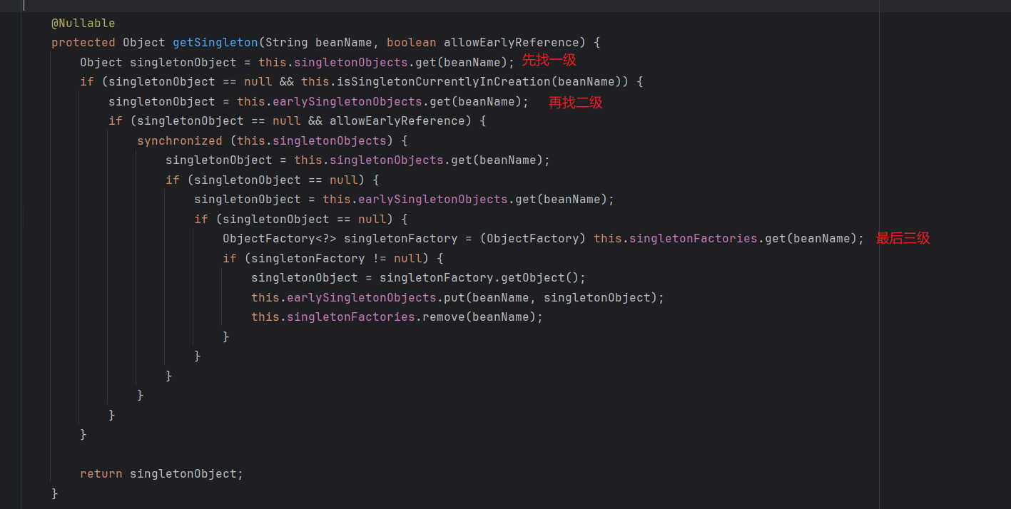 三级缓存singletonFactories:存储半成品,对象未被引用,一开始存储地点