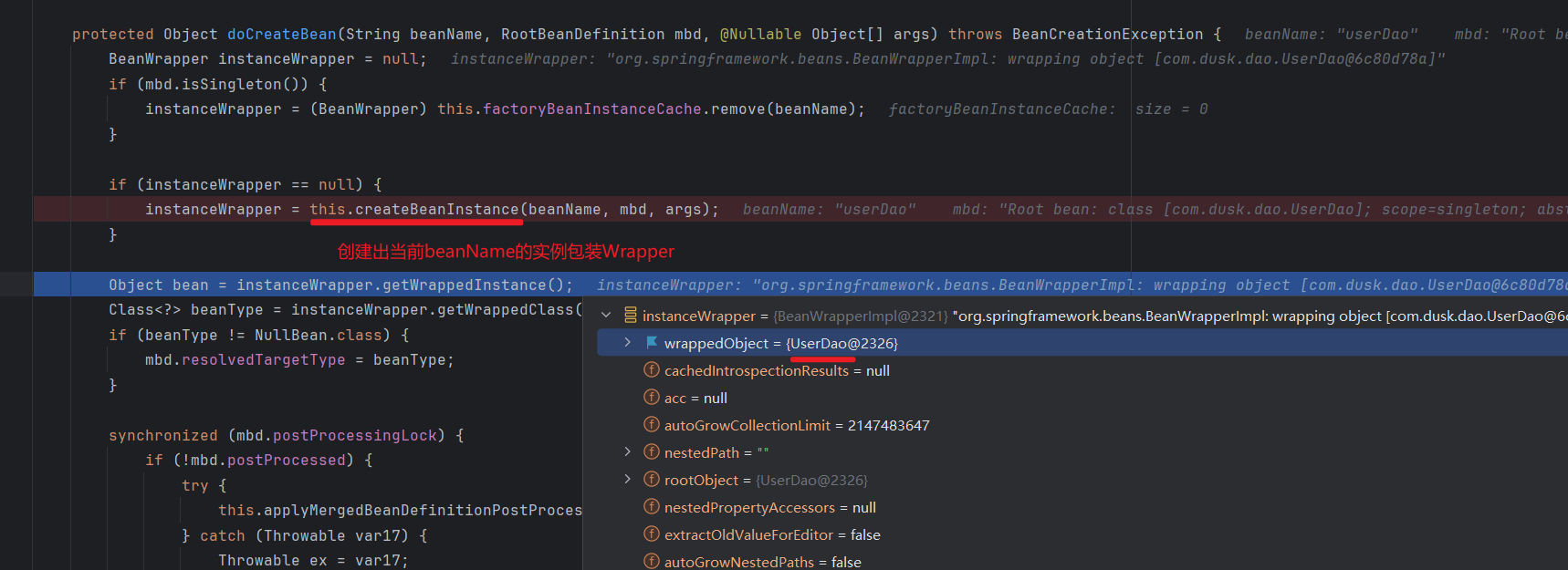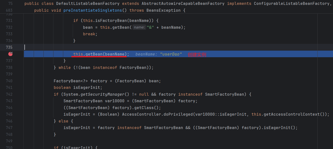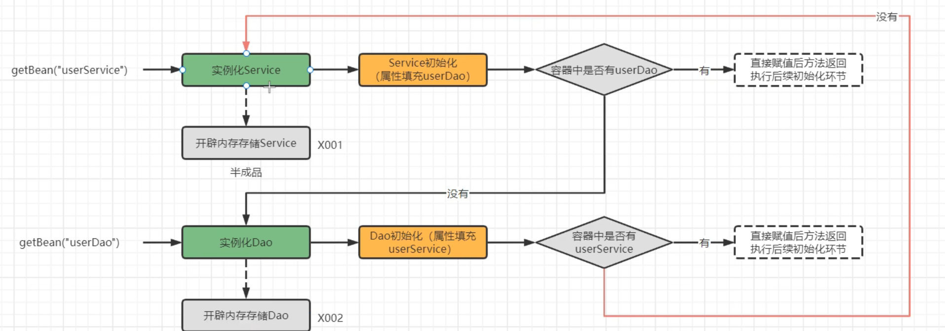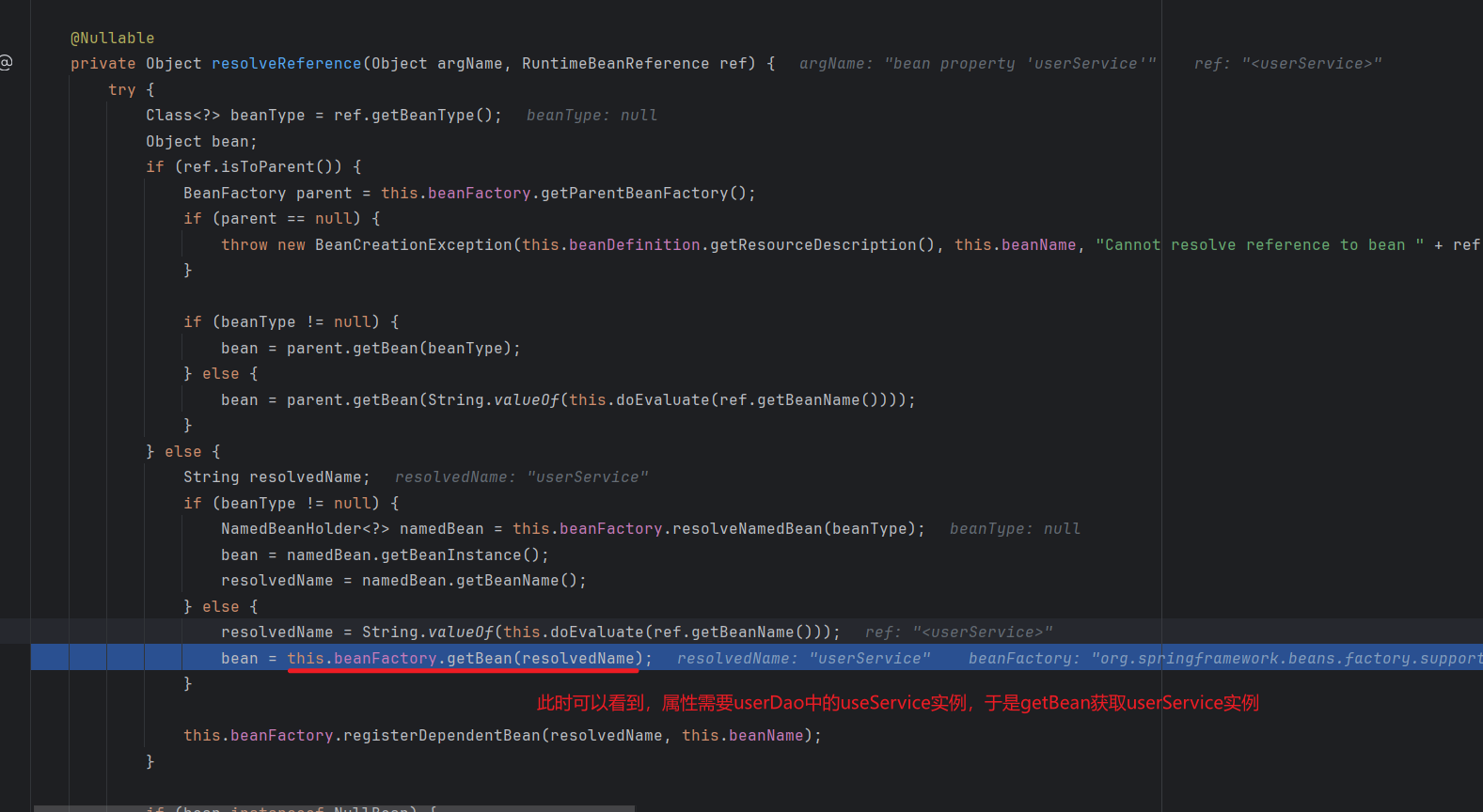 于是又执行一次getBean去创建userService实例对象,再将userDao从三级缓存注入到userService