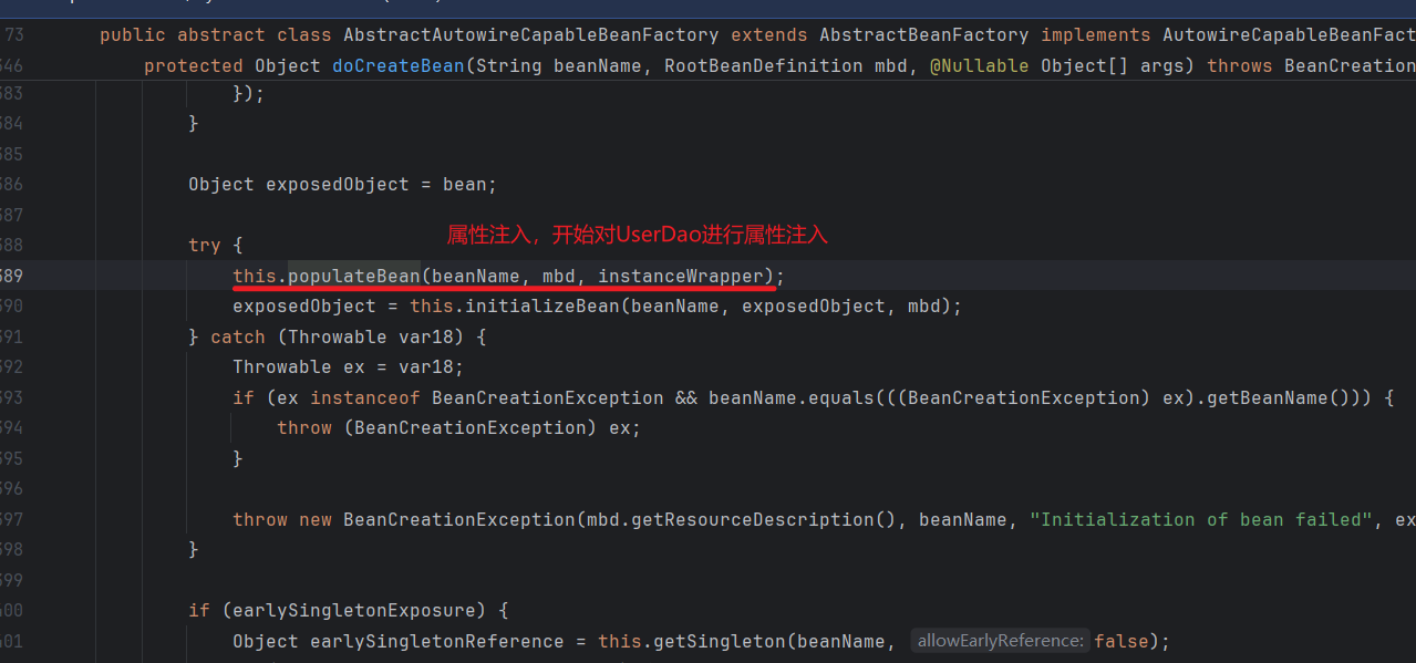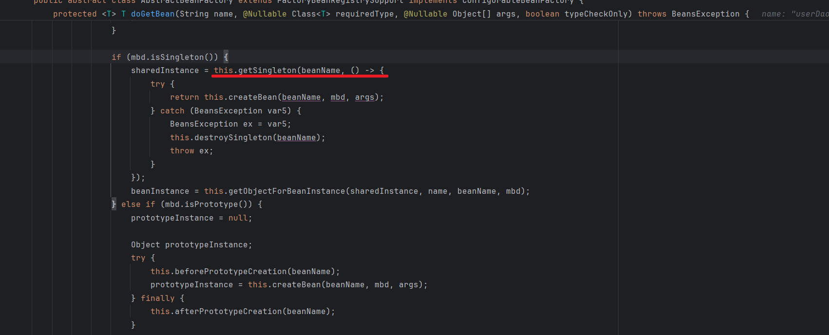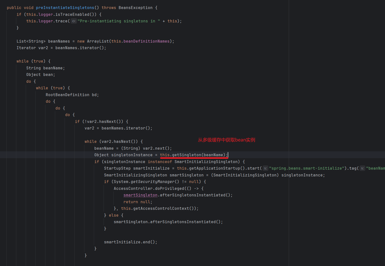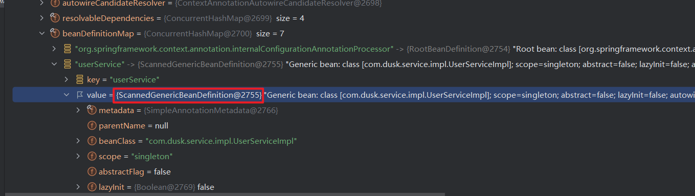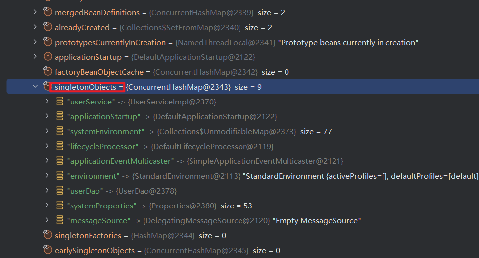 于是又执行一次getBean去创建userService实例对象,再将userDao从三级缓存注入到userService