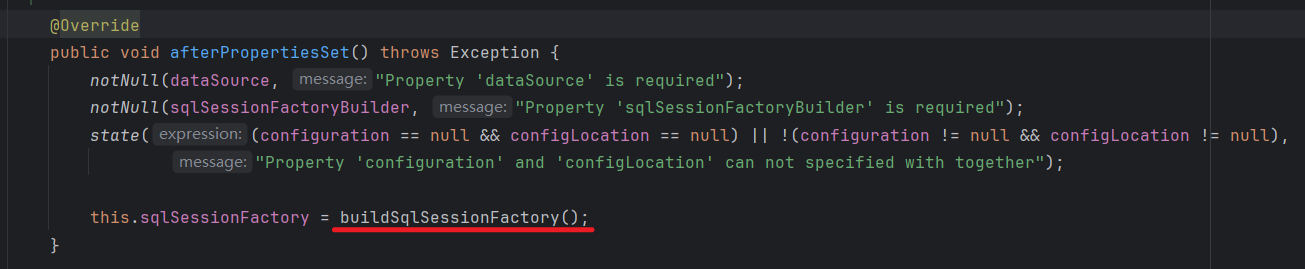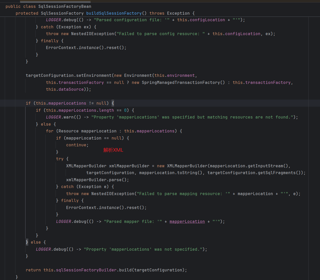 当spring创建其他bean时,发现需要依赖对应的mapper和sqlSessionFactory时;spring首先会去通过执行InitializingBean接口的afterProjpertiesSet实现方法;buildSqlSessionFactory会去创建对象,解析执行XML内容,最后创建出重量级的sqlSessionFactory。