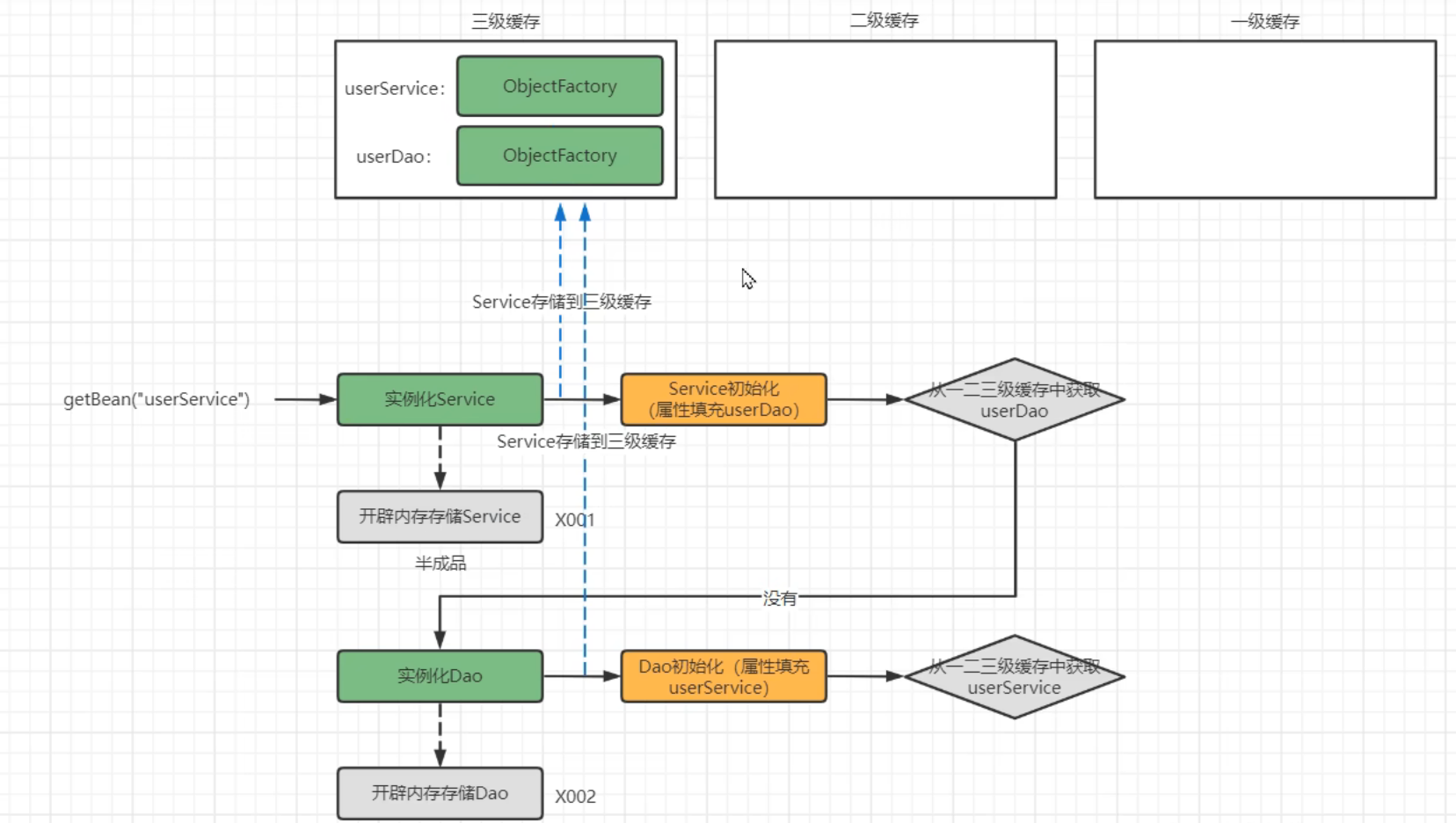 文字描述:实例化Service后存储三级缓存,进入属性填充步骤需要引用Dao,于是去一二三级逐级获取Dao,此时未找到该对象;就去实例化Dao,再去一二三级缓存中获取Service注入Dao中,Dao经过其他周期后存储到一级缓存,同时删除二三级的Dao,最后Service注入Dao完成实例化存储到一级缓存,删除二三级缓存的Service。