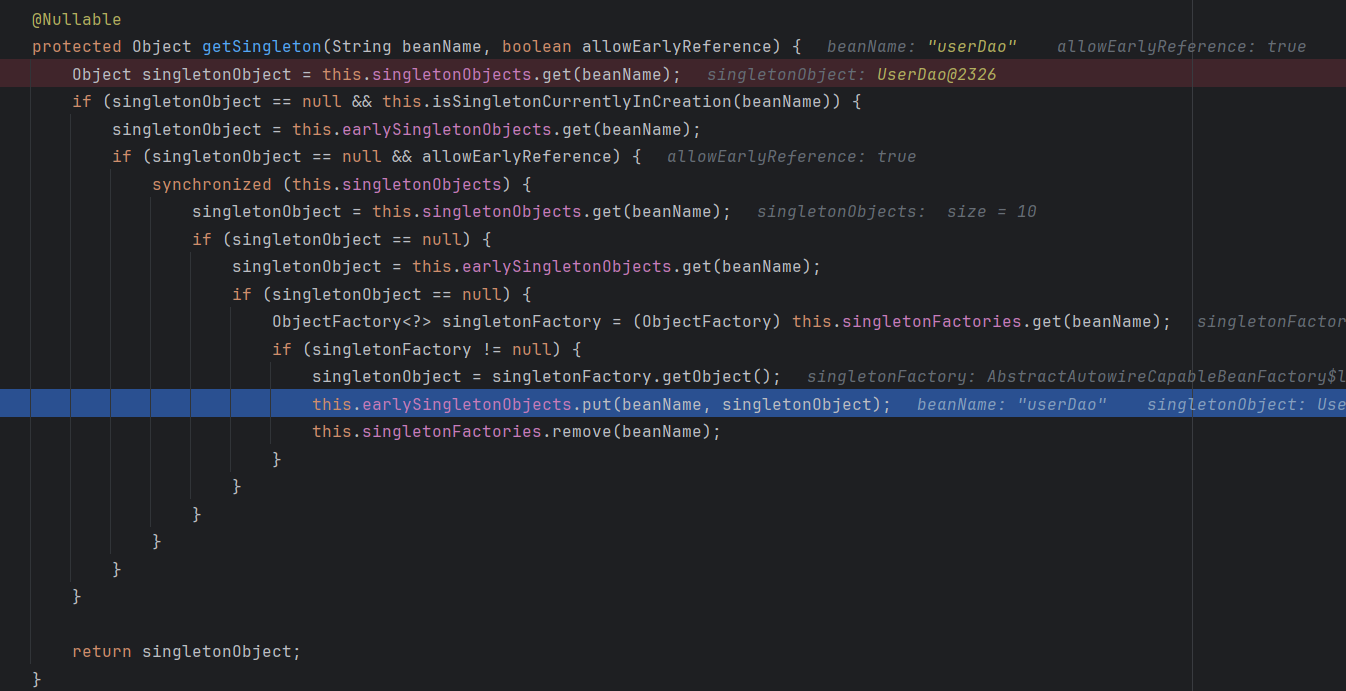 二级缓存earlySingletonObjects:存储半成品,且当前对象已被其他对象引用