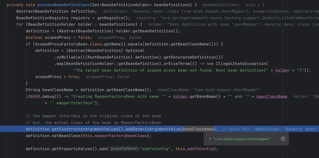 创建ClassPathMapperScanner对象,执行父类的scan方法,scan方法再去调用子类重写的doScan方法。为每个mapper接口创建一个Beandefinition对象,并将这个beandefinition对象的beanClass指向为MapperFactoryBean类型。