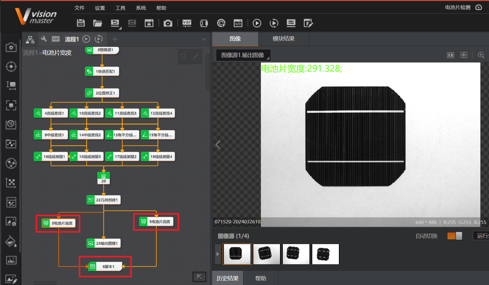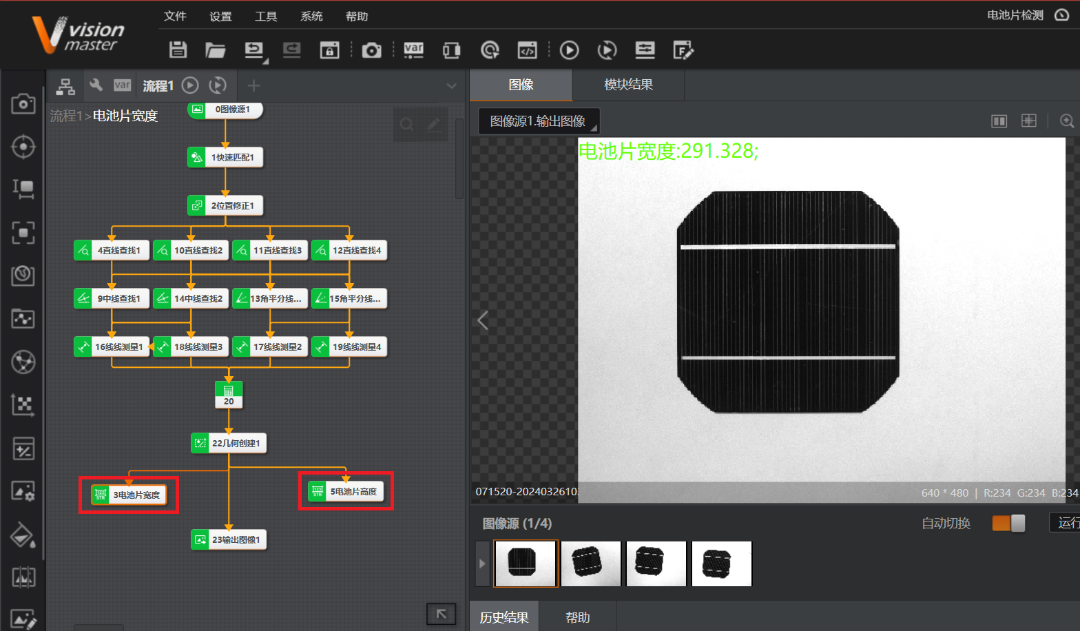 本示例中的检测程序基于VisionMaster,用于检测电池片的各项尺寸信息。我们可以看到电池片的宽度信息及高度信息等。