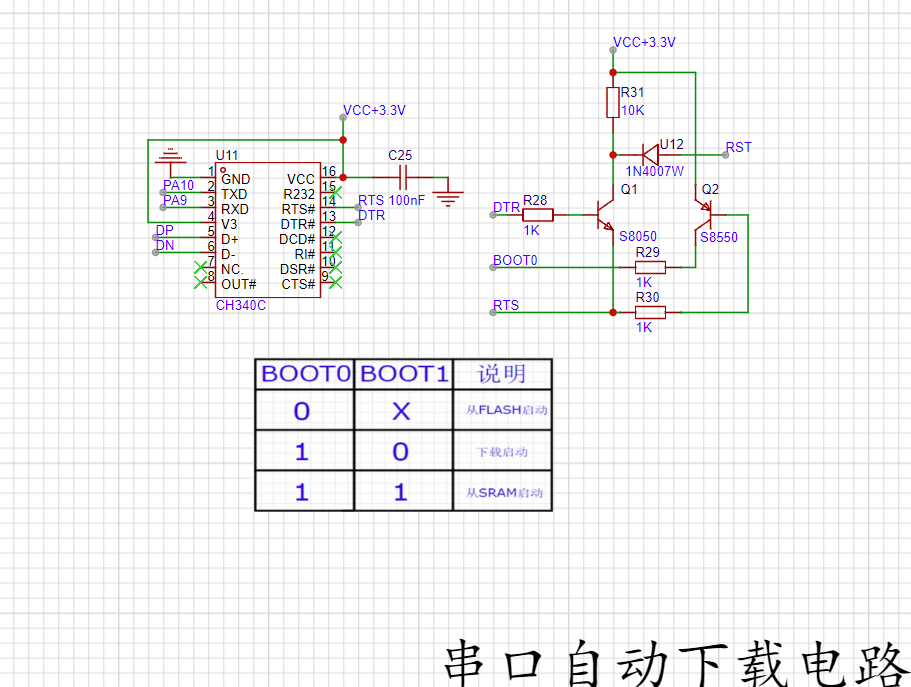之后DTR置高,则实际DTR输出低电平,S8050关断,RST为高电平,RTS持续置高,则实际输出低电平,S8550导通BOOT0为高电平,最后RTS拉低,实际输出高电平,S8550关断,BOOT0变为低电平,单片机从FLASH启动。