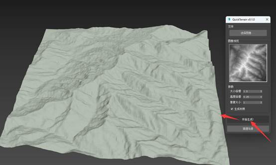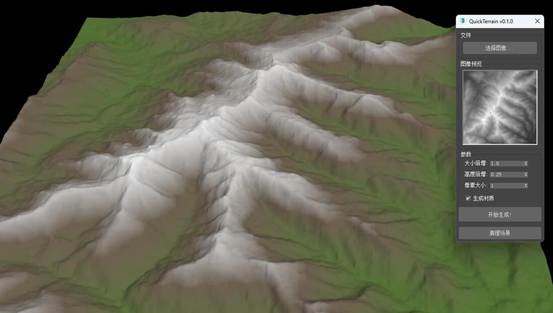 3.生成地形。点击"开始生成!"按钮,等待进度条完成(根据图像大小和处理时间可能不同),生成完成后,地形将自动放置在场景原点。如图: