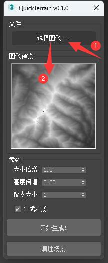 1.打开QuickTerrain插件,点击"选择图像..."按钮,在弹出的文件对话框中选择一张灰度图像(推荐使用黑白分明、像素平滑的灰度图);选择成功后,图像将在“图像预览”区域显示,如图: