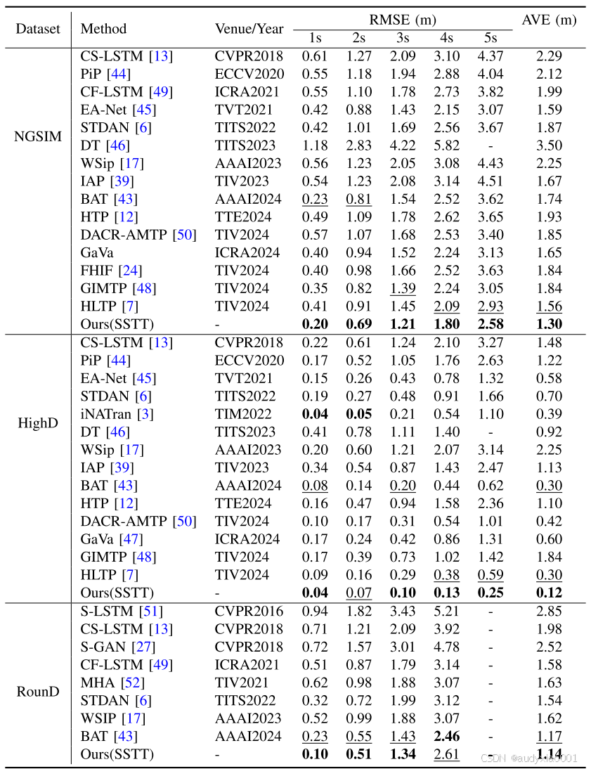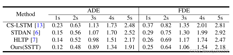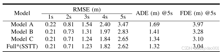 (1)RMSE(均方根误差):核心指标,计算预测点与真实点之间的欧氏距离,对较大误差更为敏感。报告在1秒至5秒多个预测时间点上的结果,以全面衡量短期到长期的预测精度。