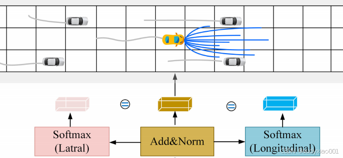 该模块负责生成最终预测,以应对未来轨迹的不确定性。如图5,它采用并行分支结构:一个分支通过MLP和Softmax层分类输出车辆的横向(如左转、保持、右转)和纵向(如加速、减速、保持)驾驶意图;另一个分支则将意图信息与时空特征融合,通过LSTM解码器生成符合未来多种可能性的多模态轨迹分布(通常用高斯混合模型表示)。这种设计不仅提高了预测精度,也增强了模型对复杂场景中不同驾驶行为的覆盖能力和决策的可解释性。