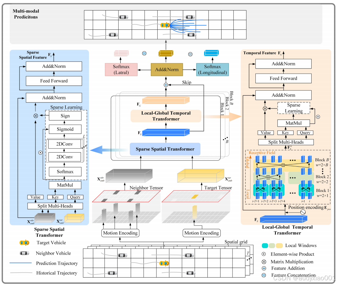 该论文为解决冗余交互问题,论文提出一种稀疏时空Transformer(SSTT),通过引入可学习的稀疏模块,优化注意力权重分布,使模型聚焦于关键交互车辆,提升预测精度与收敛效率。同时,设计局部-全局时序Transformer,在降低计算复杂度的前提下捕捉长短期时间依赖关系。
