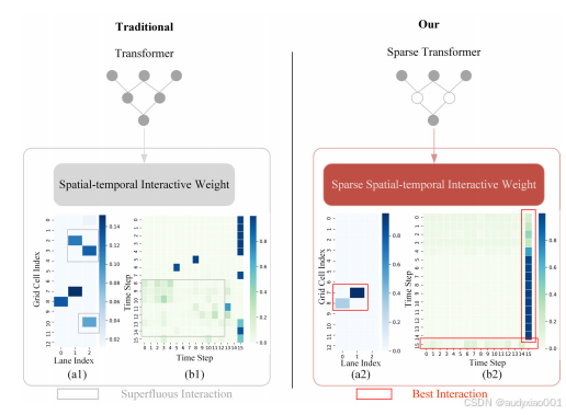 该模块旨在精准筛选出对目标车辆有实质影响的邻居车辆。它在标准的多头注意力机制后,增加了一个可训练的稀疏化层。该层会计算一个动态阈值,将注意力权重图中代表微弱或冗余交互的权重置零,从而生成一个“稀疏”的注意力图谱。这使得模型能够排除无关车辆的干扰,将计算资源集中在对预测至关重要的关键交互上,显著提升了空间交互感知的准确性。如图3,左侧(传统Transformer),注意力权重在所有邻车中均匀分配,无法突出关键交互;右侧(SST),通过稀疏模块过滤低权重冗余交互,仅保留高权重的关键邻车影响。