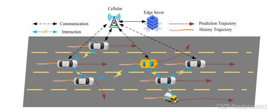 随着人工智能与自动驾驶技术的快速发展,车联网环境下的车辆轨迹预测成为提升交通系统智能化水平与通信安全的关键技术。如图1,通过车辆间实时数据共享,系统能够扩展感知范围并支持分布式处理,但同时也对数据传输效率与用户隐私保护提出了更高要求。当前,基于深度学习的轨迹预测方法,尤其是采用注意力机制的Transformer模型,虽在捕捉时空依赖关系方面展现出潜力,却普遍存在冗余交互问题,即难以有效过滤非关键车辆的影响,导致注意力分散、预测稳定性下降,且模型计算成本高、依赖大量数据,制约了其在真实场景中的部署效果。因此,需要一种能够精准聚焦关键交互、兼顾效率与精度的轻量化预测方法,以支撑车联网在复杂动态交通环境中的实际应用。