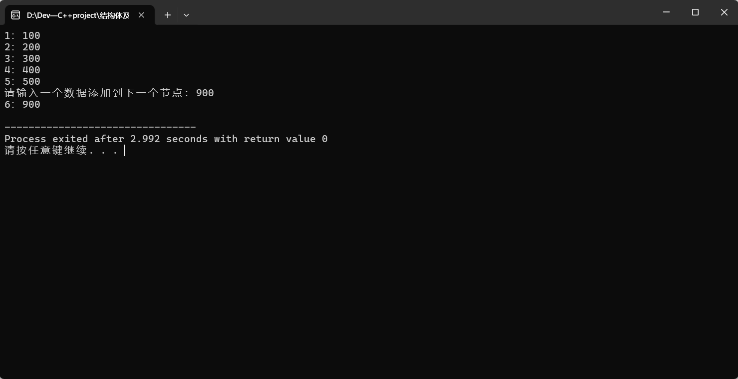 };int main() {//先创建多个节点,并分配内存ListNode *node1 = (ListNode *)malloc(sizeof(ListNode));ListNode *node2 = (ListNode *)malloc(sizeof(ListNode));ListNode *node3 = (ListNode *)malloc(sizeof(ListNode));ListNode *node4 = (ListNode *)malloc(sizeof(ListNode));ListNode *node5 = (ListNode *)malloc(sizeof(ListNode));node1->data = 100;node2->data = 200;node3->data = 300;node4->data = 400;node5->data = 500;//接下来将所有的节点连接node1->next = node2;node2->next = node3;node3->next = node4;node4->next = node5;//接下来只能借助头节点进行链表的相关操作printf("1:%d\n", node1->data);printf("2:%d\n", node1->next->data);printf("3:%d\n", node1->next->next->data);printf("4:%d\n", node1->next->next->next->data);printf("5:%d\n", node1->next->next->next->next->data);//添加一个新的节点ListNode *newNode = (ListNode *)malloc(sizeof(ListNode));node5->next = newNode;//将输入的数字添加到下一个节点上int n;printf("请输入一个数据添加到下一个节点:");scanf("%d", &n);newNode->data = n;newNode->next = NULL;printf("6:%d\n", node1->next->next->next->next->next->data);return 0;