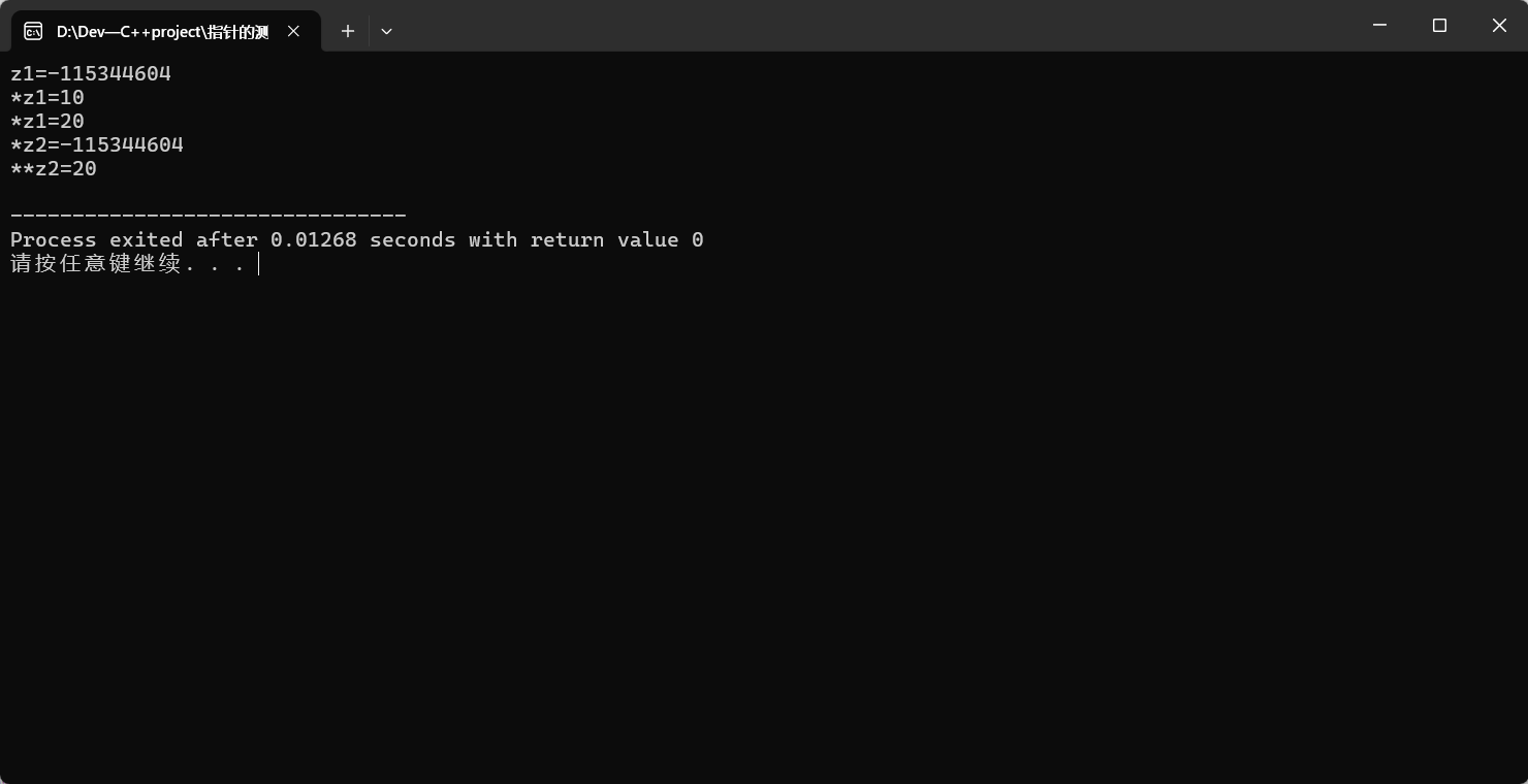 #include <stdlib.h>int main() {int a = 10;//定义一个指针变量存储变量a的地址int *z1 = &a;//直接打印z1printf("z1=%d\n", z1);//打印z1地址下对应的变量printf("*z1=%d\n", *z1);//改变z1保存的地址对应的数据*z1 = *z1 + 10;printf("*z1=%d\n", *z1);int **z2 = &z1;printf("*z2=%d\n", *z2);printf("**z2=%d\n", **z2);