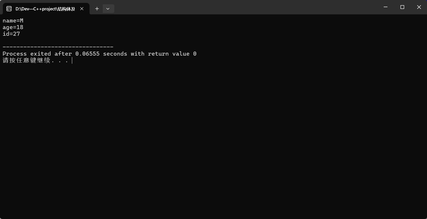 int main() {struct Student s;s.name = 'M';s.age = 18;s.id = 27;printf("name=%c\n", s.name);printf("age=%d\n", s.age);printf("id=%d\n", s.id);return 0;