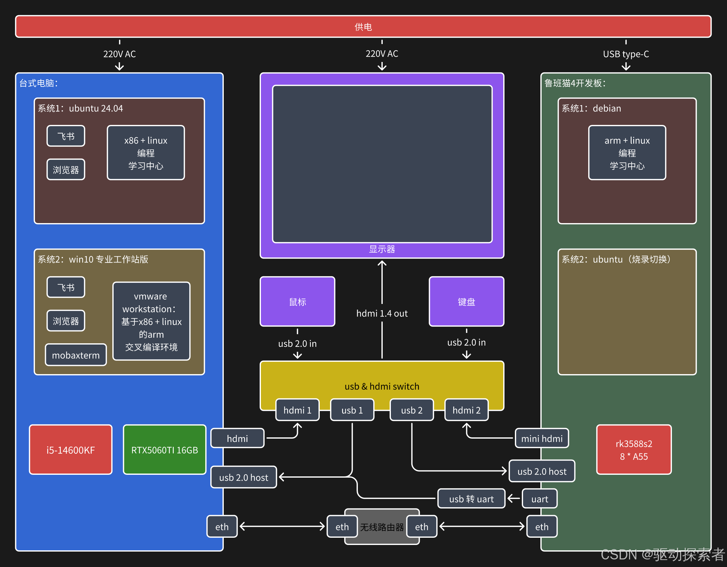 同样是linux的学习,在arm和x86平台上有很多不同,比如启动流程上UEFI和bootrom之类的,比如内存屏障内存序上,获取设备的方式acpi和dts之类的,所以想成为linux方面的专家,x86和arm在家都要有一个环境可以进行实践,通过对比加深对概念的记忆,下面基于组装台式机和arm开发板讲解一下我当前的学习硬件构成