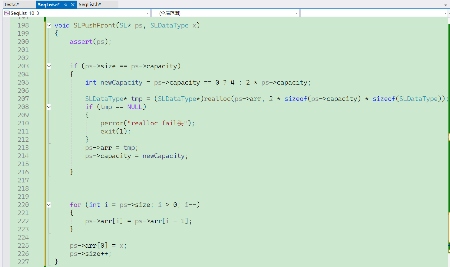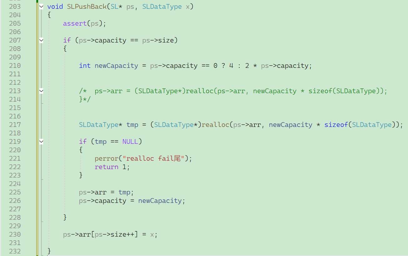 - 注意;213~214写法错误(注释部分),因为我们并不知道是否能成功申请空间,如果失败了,则arr之前的空间也一并不见了,所以realloc申请的空间不能返回给ps->arr,我们可以先返回给一个临时变量tmp。