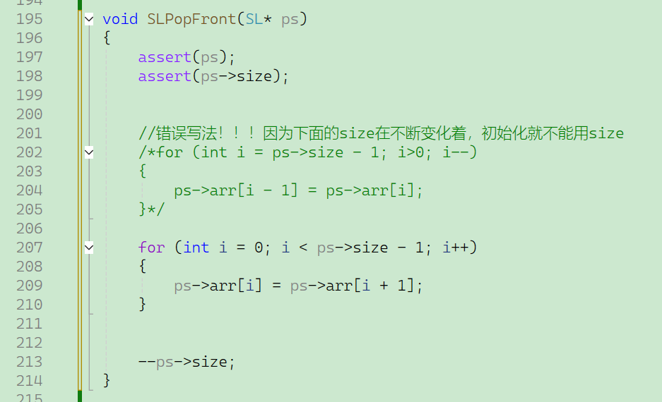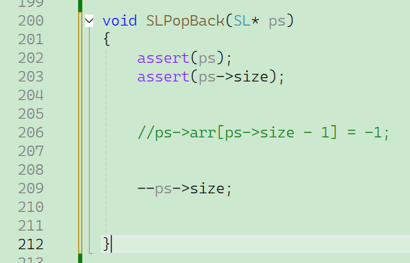 - 首先得assert断言一下,其次203行的assert是为了判断顺序表是否为空,如果为空就不能进行删除操作。