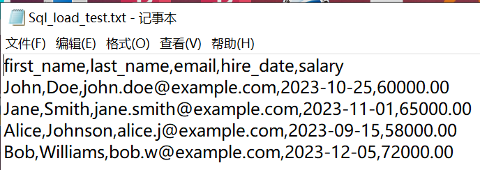 之后,使用 load data infile ‘文件的地址’ into table 表名 fields terminated ‘文件数据之间分割的符号,比如‘,’’ lines terminated ‘数据行之间的分割符,如‘\n’’ ignor n lines(忽略前n行)( first_name, last_name, email, hire_date, salary );(列映射)