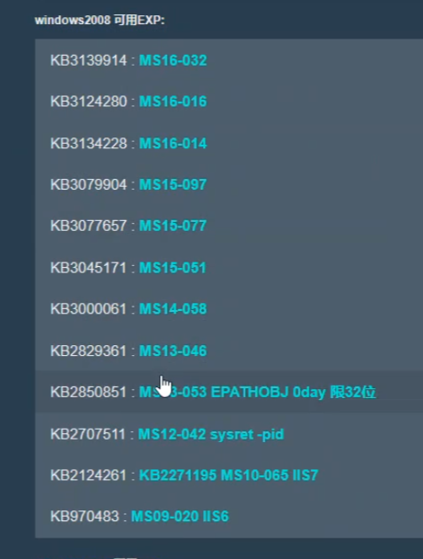 通过收集系统上的补丁编号,找到没有打补丁的漏洞,找没有打补丁的漏洞的利用工具进行利用