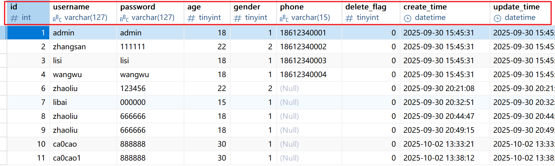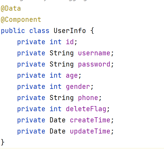 public class UserInfo {private int id;private String username;private String password;private int age;private int gender;private String phone;private int deleteFlag;private Date createTime;private Date updateTime;