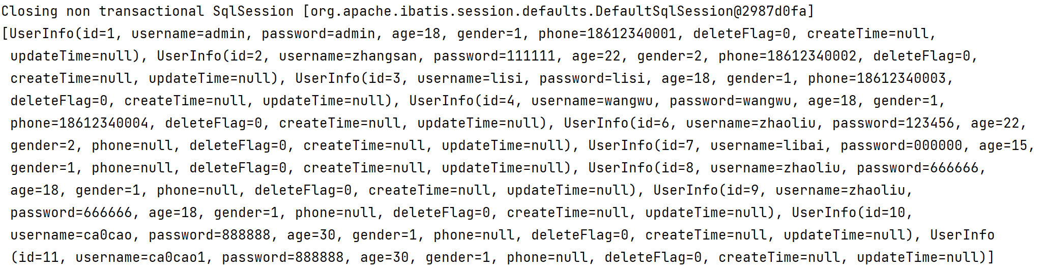 public interface UserInfoMapper {// 结果映射@Results(id = "UserInfoResultMap", value = {@Result(column = "delete_flag", property = "deleteFlag"),@Result(column = "create_time", property = "createTime"),@Result(column = "update_time", property = "updateTime")})@Select("select * from userinfo")List<UserInfo> getUserInfo3();@Select("select id, username, password, delete_flag, create_time, update_time from userinfo")@ResultMap(value = "UserInfoResultMap")List<UserInfo> getUserInfo4();