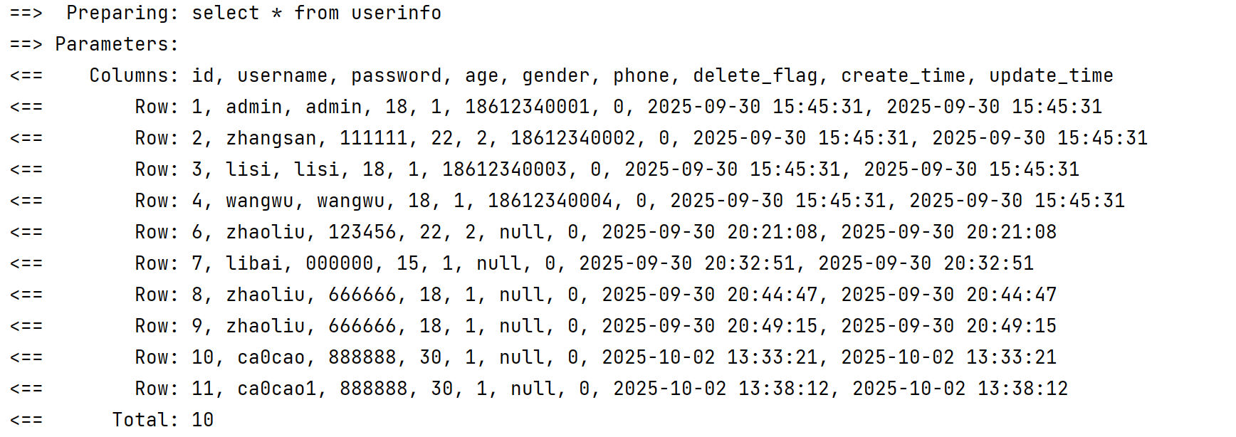 public interface UserInfoMapper {// 查询// 起别名@Select("select id, username, password, age, gender, phone, " +"delete_flag as deleteFlag, create_time as createTime, update_time as updateTime from userinfo")List<UserInfo> getUserInfo2();