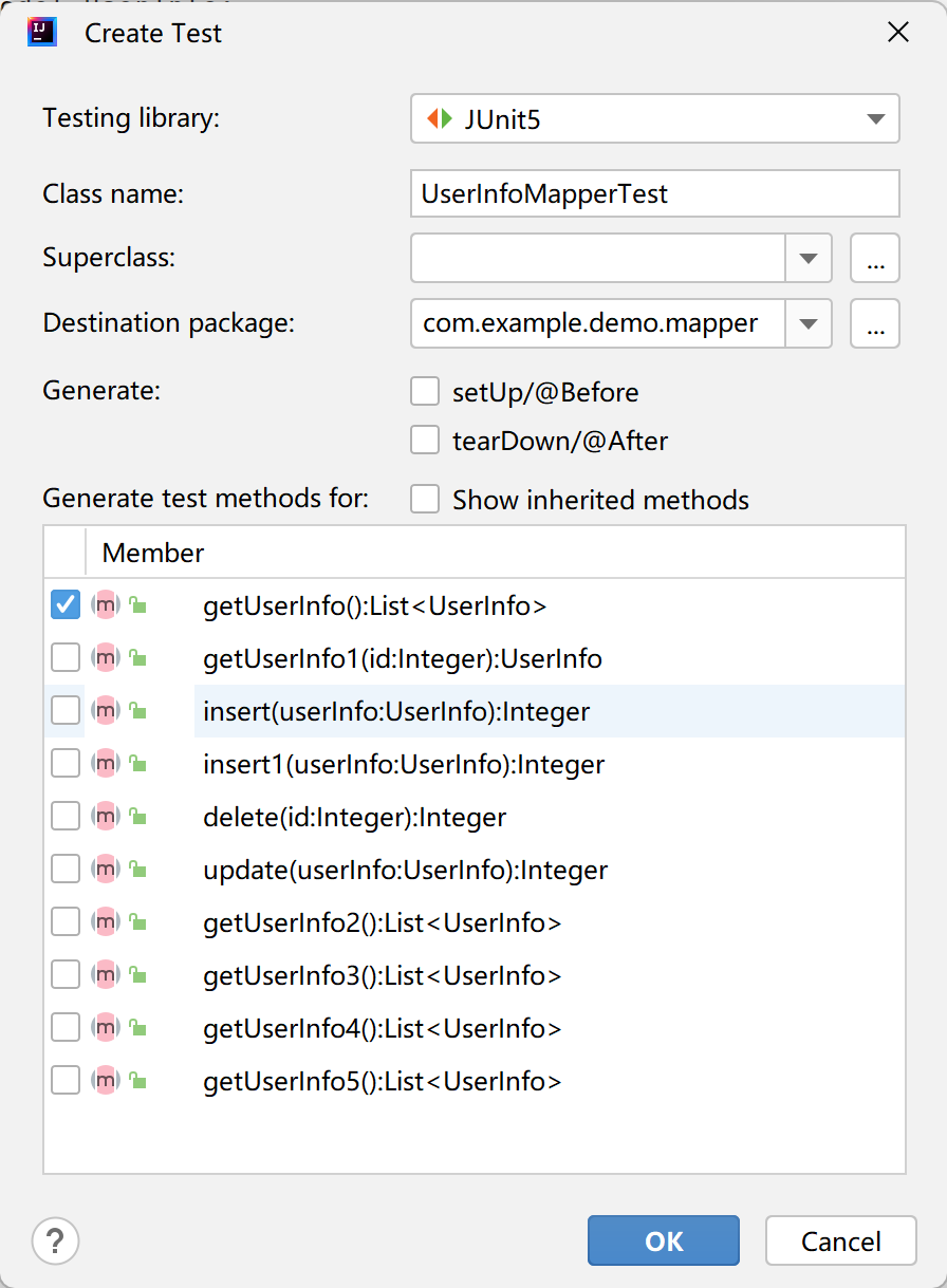 class UserInfoMapperTest {@Autowiredprivate UserInfoMapper userInfoMapper;@Testvoid getUserInfo() {List<UserInfo> userInfoList = userInfoMapper.getUserInfo();System.out.println(userInfoList);}