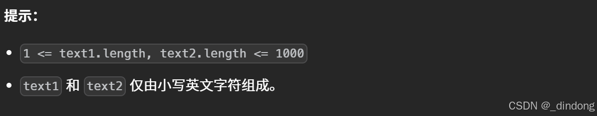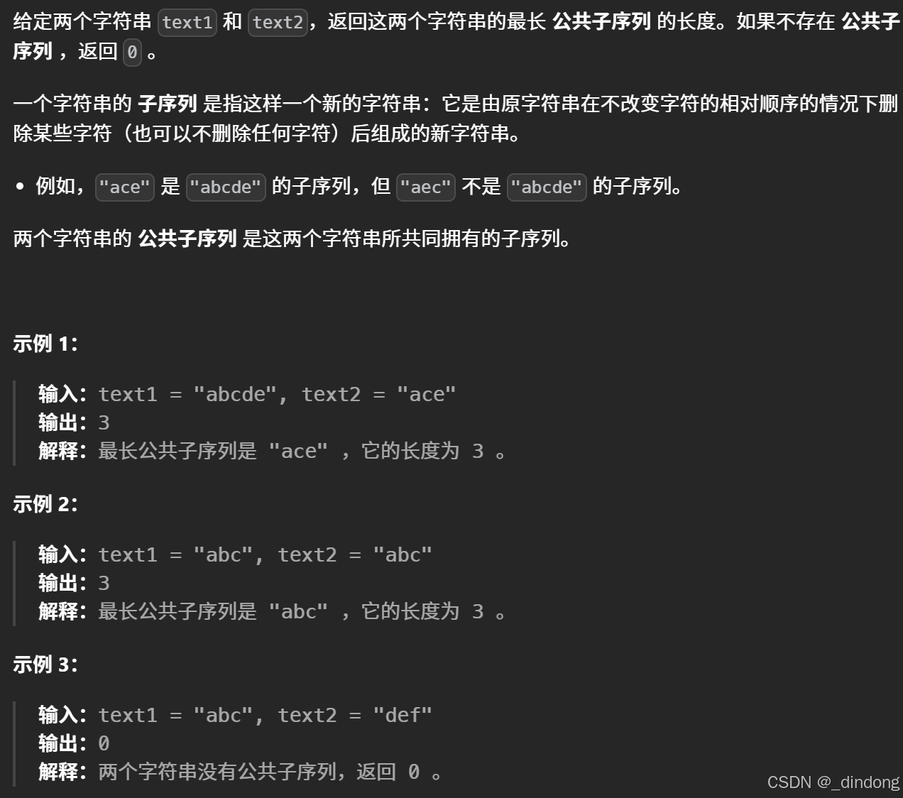 public:int longestCommonSubsequence(string text1, string text2) {int m=text1.size(),n=text2.size();vector<vector<int>> dp(m+1,vector<int>(n+1));for(int i=1;i<=m;++i){for(int j=1;j<=n;++j){if(text1[i-1]==text2[j-1])dp[i][j]=dp[i-1][j-1]+1;else dp[i][j]=max(dp[i-1][j],dp[i][j-1]);}}return dp[m][n];}