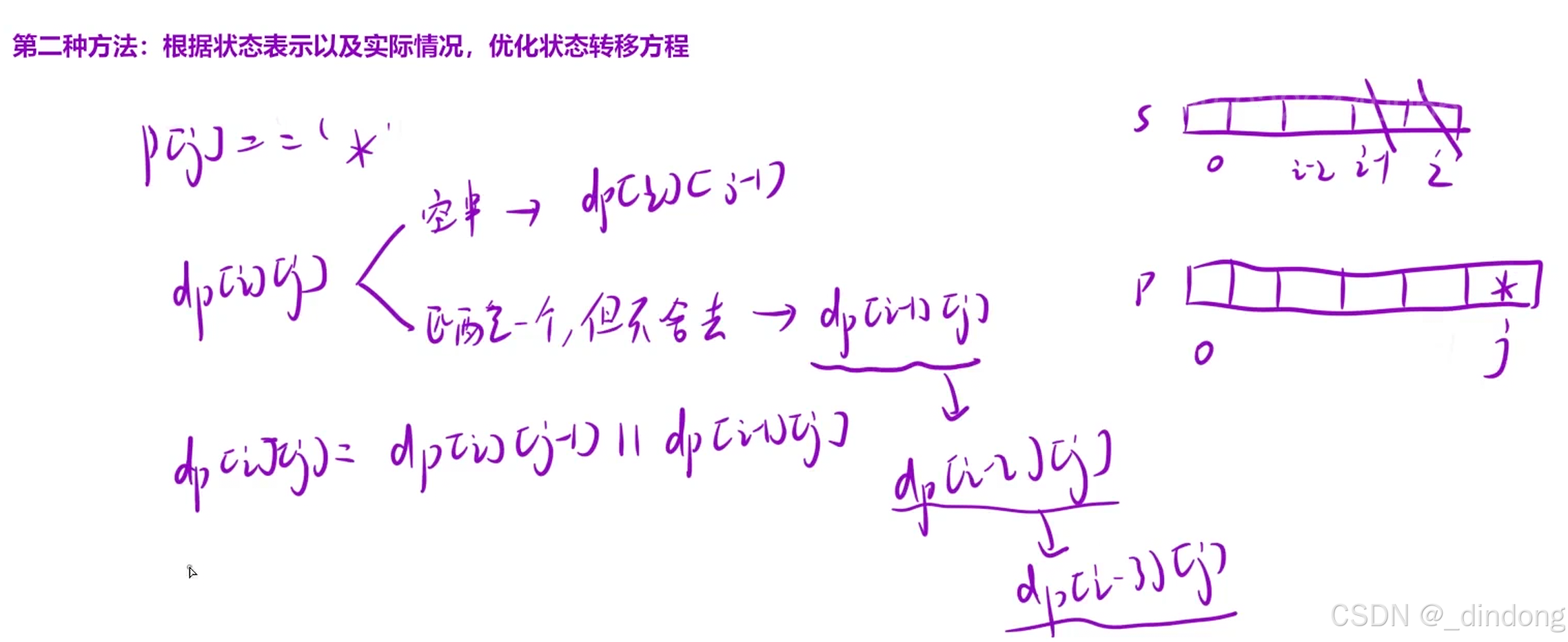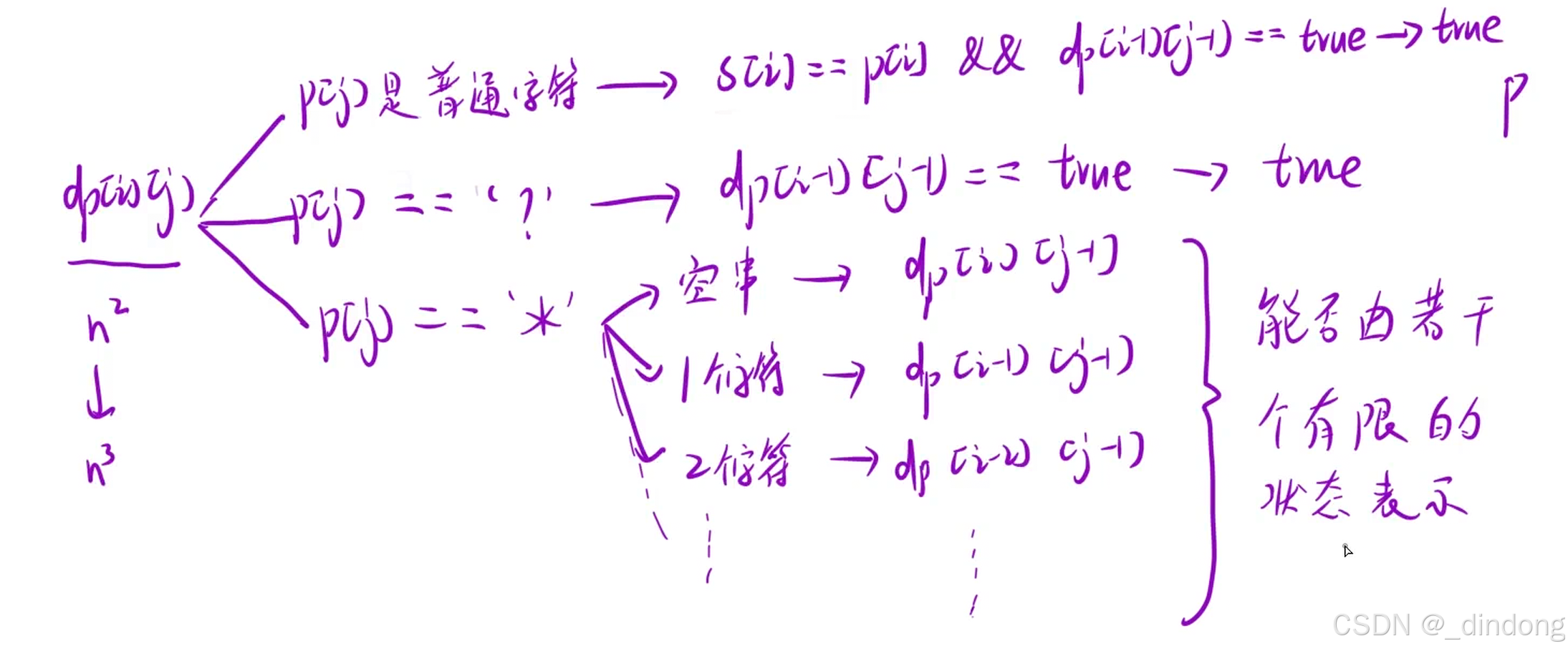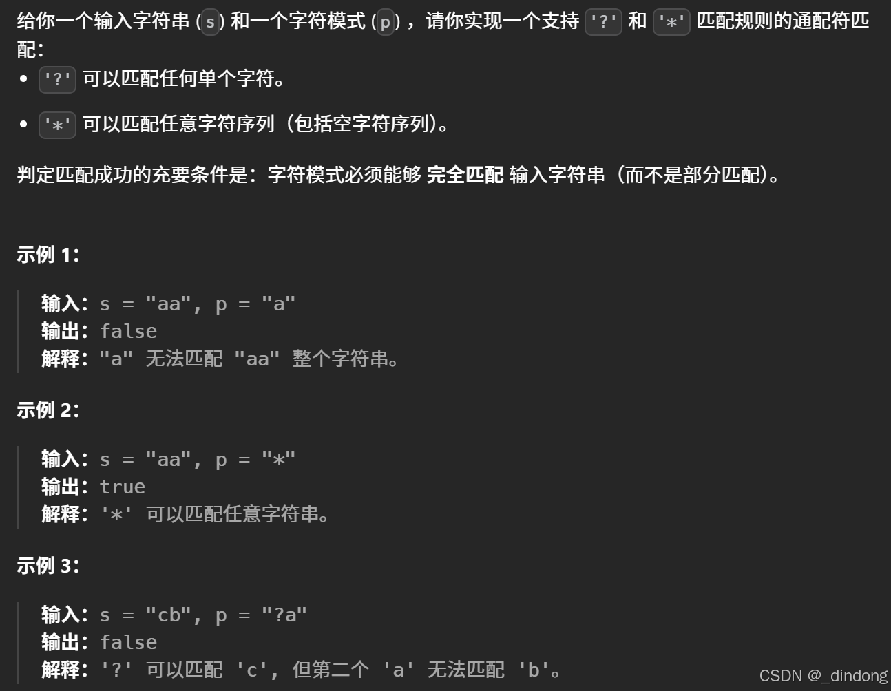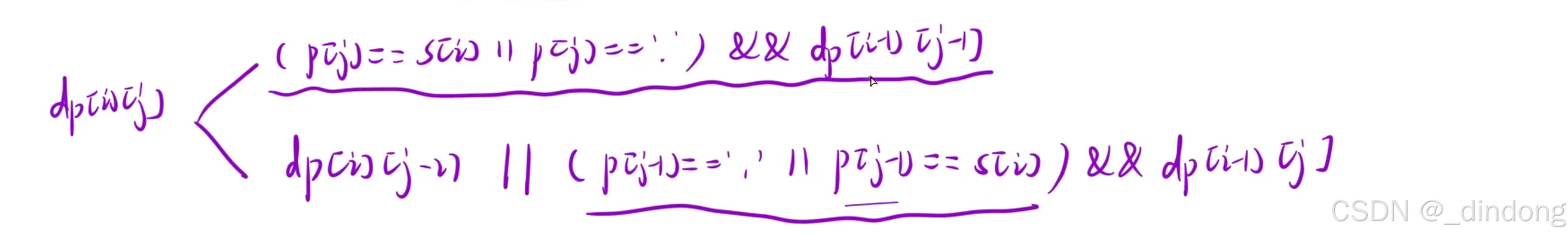 public:bool isMatch(string s, string p) {//准备工作int m=s.size(),n=p.size();vector<vector<bool>> dp(m+1,vector<bool>(n+1));s=" "+s,p=" "+p;//初始化dp[0][0]=true;for(int j=1;j<=n;++j){if(p[j]=='*')dp[0][j]=true;else break;}//填表for(int i=1;i<=m;++i){for(int j=1;j<=n;++j){if(p[j]=='*'){dp[i][j]=dp[i][j-1]||dp[i-1][j];}else{dp[i][j]=(p[j]=='?'||s[i]==p[j])&&dp[i-1][j-1];}}}return dp[m][n]; }