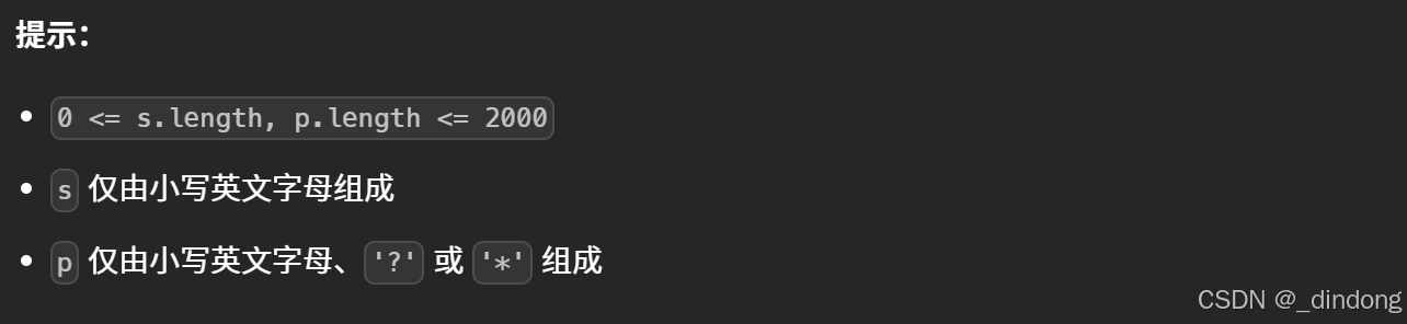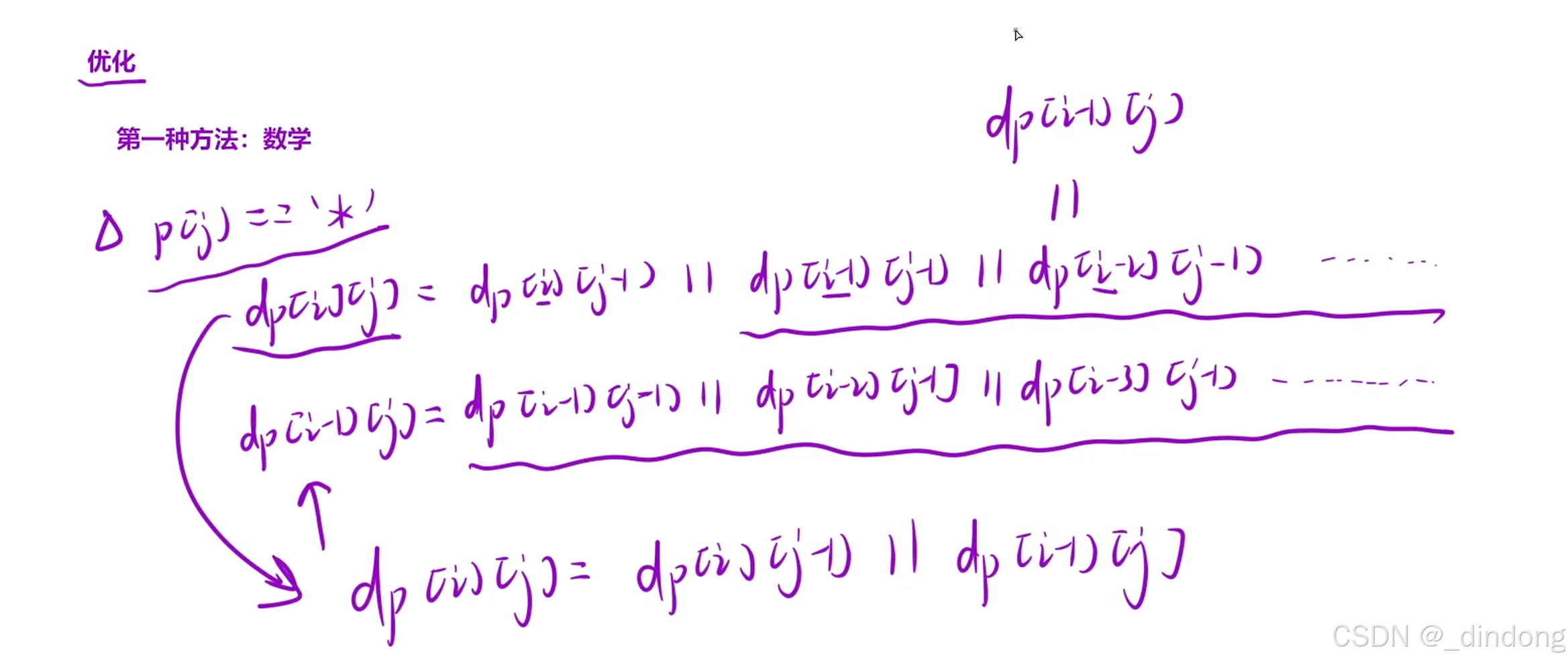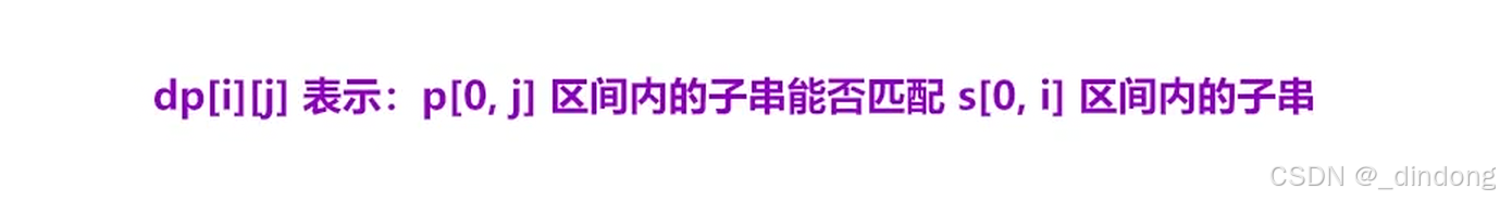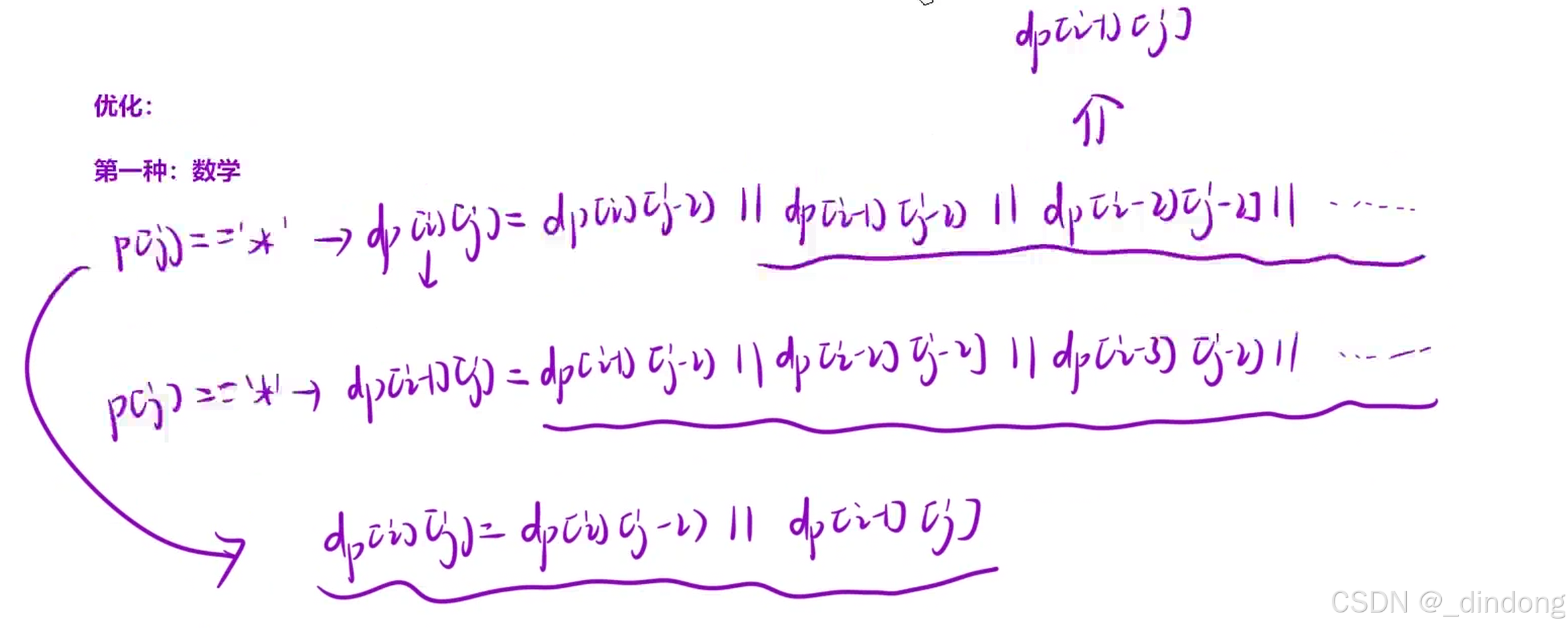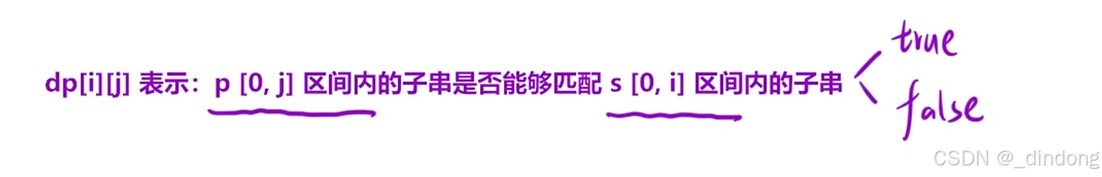 public:bool isMatch(string s, string p) {//准备工作int m=s.size(),n=p.size();vector<vector<bool>> dp(m+1,vector<bool>(n+1));s=" "+s,p=" "+p;//初始化dp[0][0]=true;for(int j=1;j<=n;++j){if(p[j]=='*')dp[0][j]=true;else break;}//填表for(int i=1;i<=m;++i){for(int j=1;j<=n;++j){if(p[j]=='*'){dp[i][j]=dp[i][j-1]||dp[i-1][j];}else{dp[i][j]=(p[j]=='?'||s[i]==p[j])&&dp[i-1][j-1];}}}return dp[m][n]; }