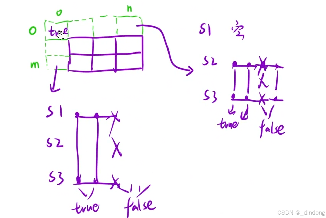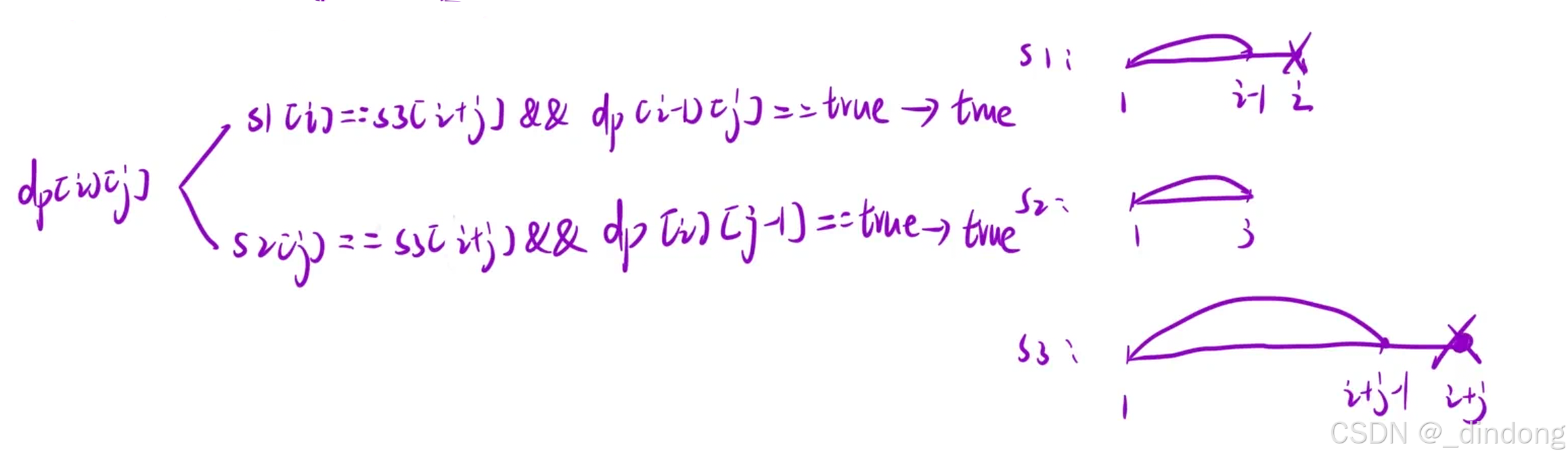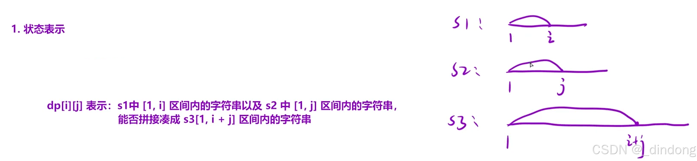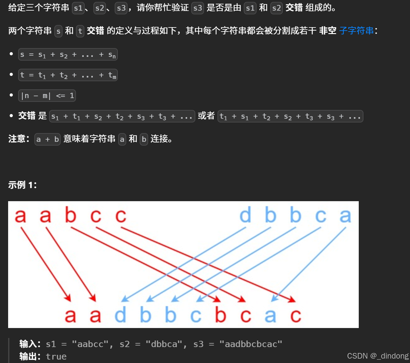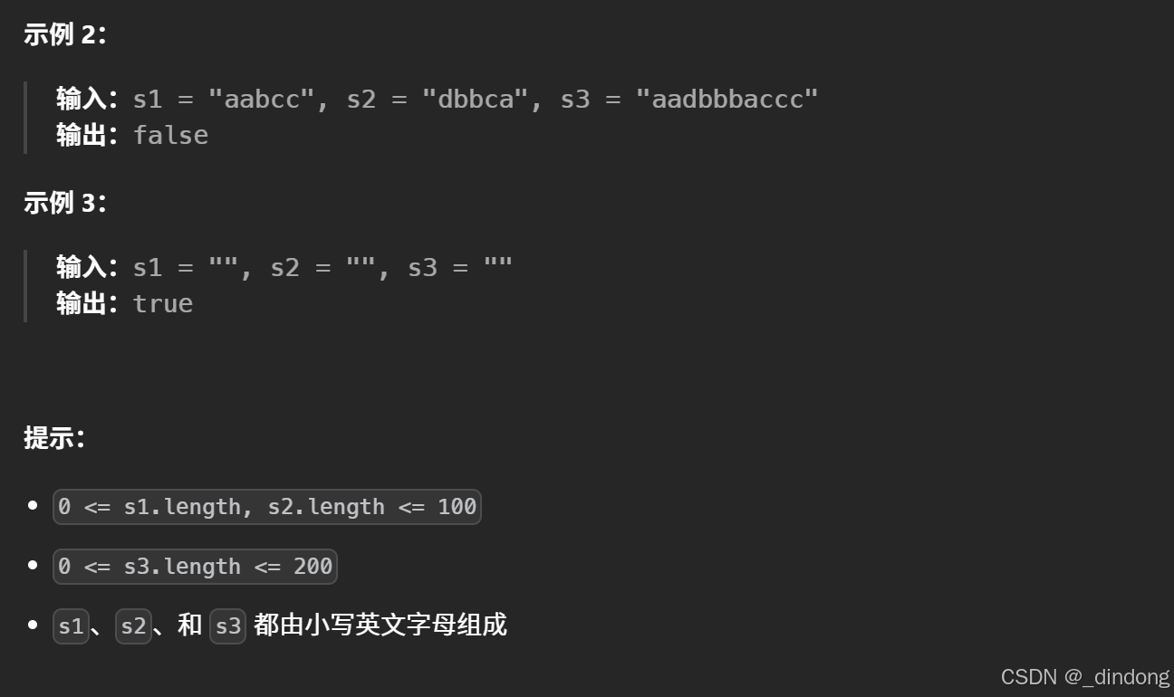 public:bool isInterleave(string s1, string s2, string s3) {int m=s1.size(),n=s2.size();//特判一下if(m+n!=s3.size())return false;vector<vector<bool>> dp(m+1,vector<bool>(n+1));dp[0][0]=true;s1=" "+s1,s2=" "+s2,s3=" "+s3;//初始化for(int j=1;j<=n;++j){if(s2[j]==s3[j])dp[0][j]=true;else break;}for(int i=1;i<=m;++i){if(s1[i]==s3[i])dp[i][0]=true;else break;}//填表for(int i=1;i<=m;++i){for(int j=1;j<=n;++j){dp[i][j]=(s1[i]==s3[i+j]&&dp[i-1][j])||(s2[j]==s3[i+j]&&dp[i][j-1]);}}return dp[m][n];}