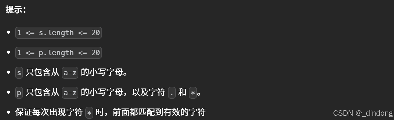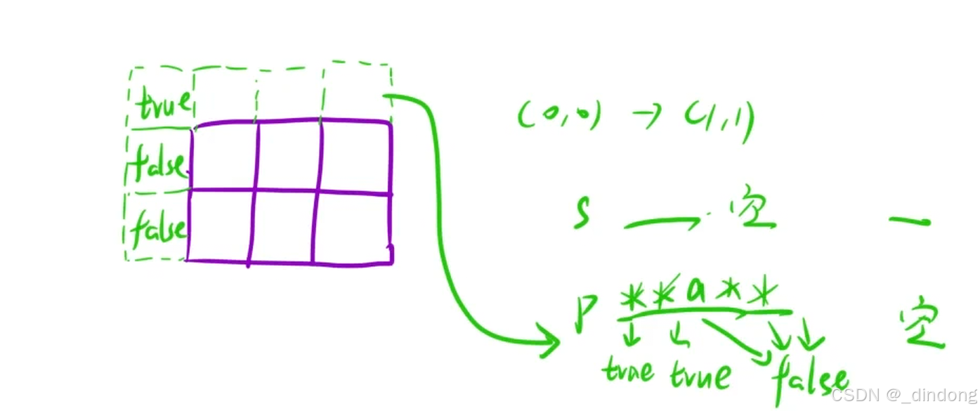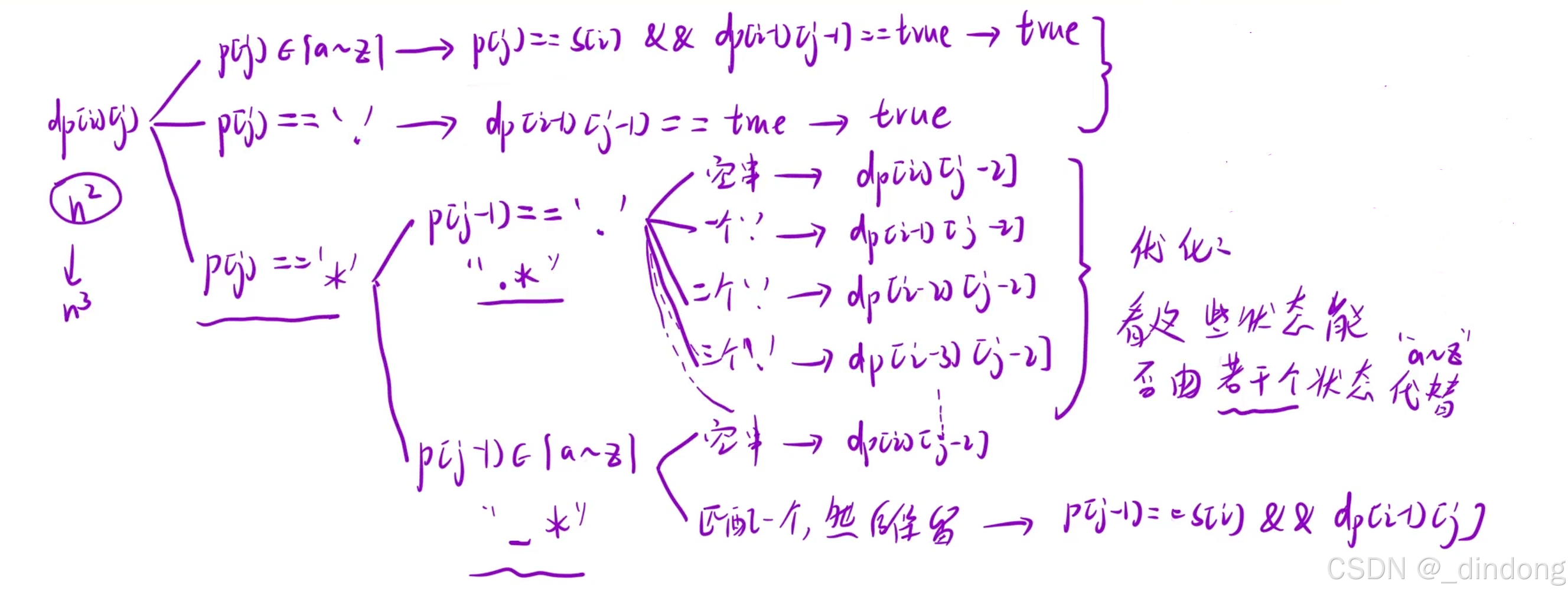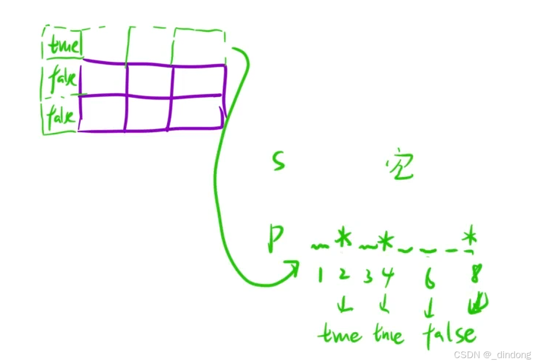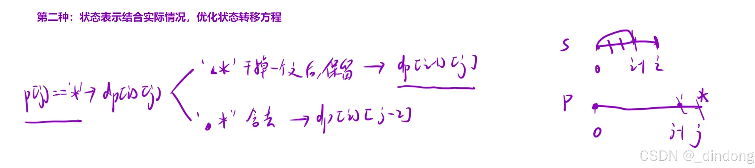public:bool isMatch(string s, string p) {// 准备工作int m = s.size(), n = p.size();vector<vector<bool>> dp(m + 1, vector<bool>(n + 1));s = " " + s, p = " " + p;// 初始化dp[0][0] = true;for (int j = 2; j <= n; j += 2) {if (p[j] == '*')dp[0][j] = true;elsebreak;}// 填表for (int i = 1; i <= m; ++i) {for (int j = 1; j <= n; ++j) {if (p[j] == '*') {dp[i][j] =dp[i][j - 2] ||((p[j - 1] == '.' || p[j - 1] == s[i]) && dp[i - 1][j]);} else {dp[i][j] =(p[j] == '.' || s[i] == p[j]) && dp[i - 1][j - 1];}}}return dp[m][n];}