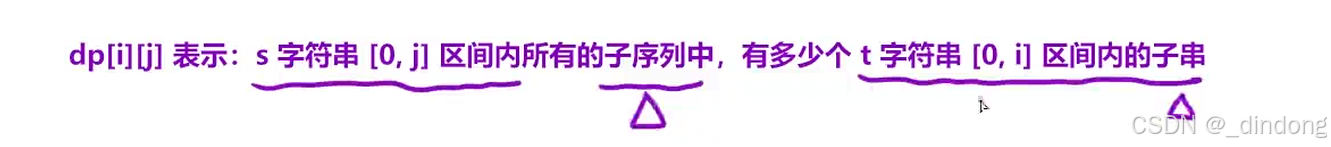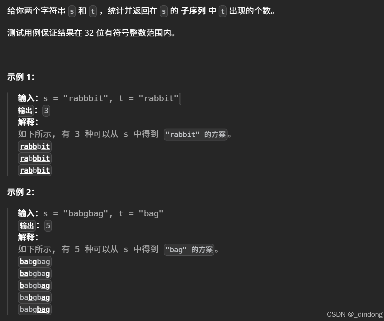 public:int numDistinct(string s, string t) {int m=t.size(),n=s.size();vector<vector<double>> dp(m+1,vector<double>(n+1));for(int j=0;j<=n;++j)dp[0][j]=1;//用t子串的每一个位置去试s的子序列for(int i=1;i<=m;++i){for(int j=1;j<=n;++j){dp[i][j]+=dp[i][j-1];if(t[i-1]==s[j-1])dp[i][j]+=dp[i-1][j-1];}}return dp[m][n];}