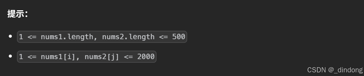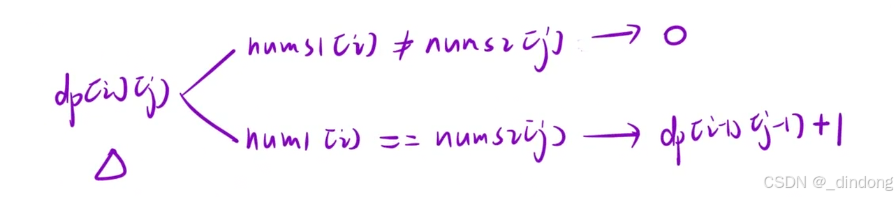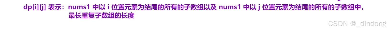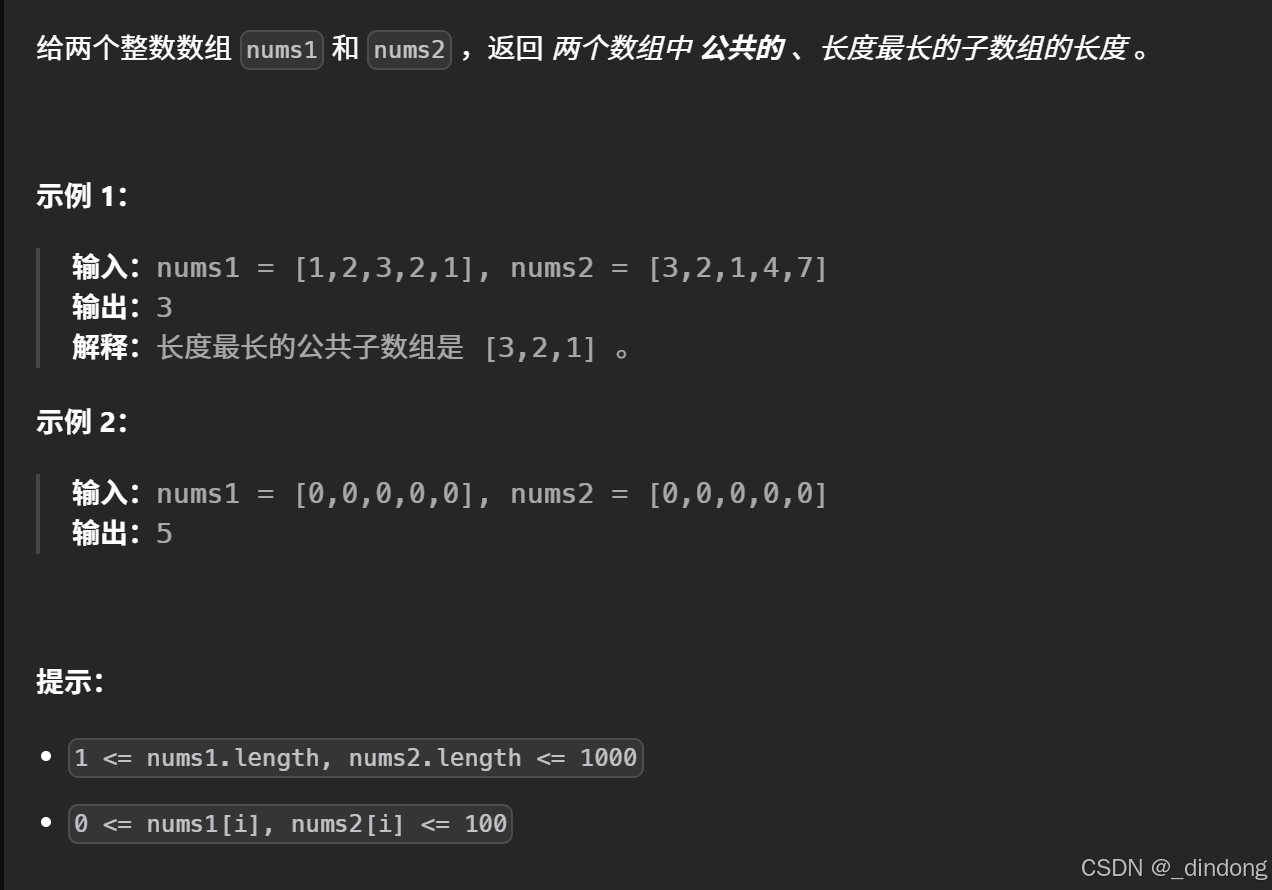 public:int findLength(vector<int>& nums1, vector<int>& nums2) {int m = nums1.size(), n = nums2.size();vector<vector<int>> dp(m + 1, vector<int>(n + 1));int ret = 0;for (int i = 1; i <= m; ++i) {for (int j = 1; j <= n; ++j) {//符合条件才更新dp值以及ret,提高效率if (nums1[i - 1] == nums2[j - 1]) {dp[i][j] = dp[i - 1][j - 1] + 1;ret = max(ret, dp[i][j]);}}}return ret;}