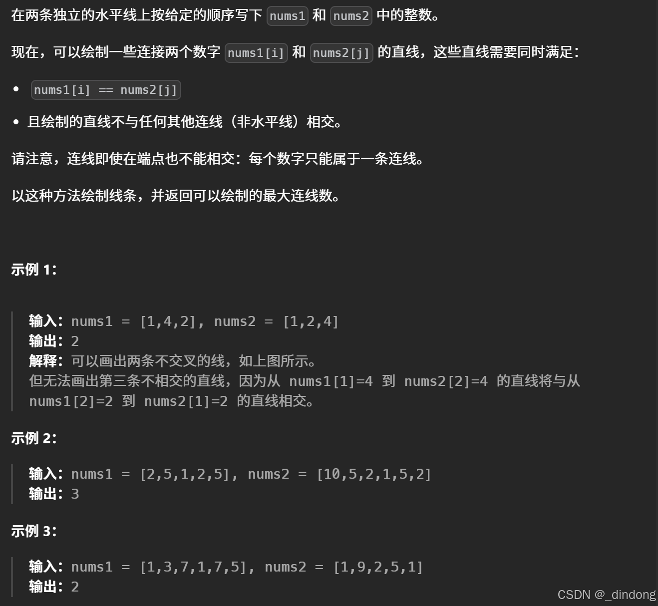 public:int maxUncrossedLines(vector<int>& nums1, vector<int>& nums2) {int m=nums1.size(),n=nums2.size();vector<vector<int>> dp(m+1,vector<int>(n+1));for(int i=1;i<=m;++i){for(int j=1;j<=n;++j){if(nums1[i-1]==nums2[j-1])dp[i][j]=dp[i-1][j-1]+1;else dp[i][j]=max(dp[i-1][j],dp[i][j-1]);}}return dp[m][n];}