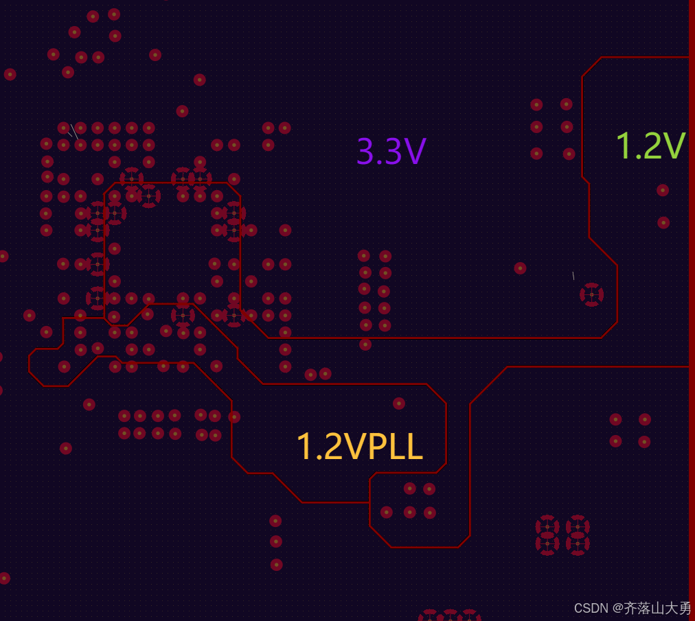 当绘制4层PCB时,PCB上存在1.2V,1.5V,3.3V等不同等级的电压的时候,需要对电源平面分割成若干块区域,分配给不同的电压,满足供电的需求。