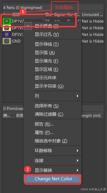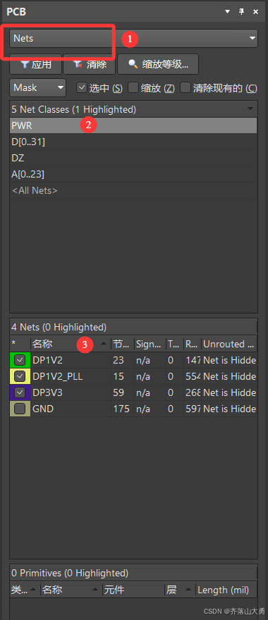 为了更好的观察不同的电压信号,首先将不同电压的焊盘标注为不同的颜色。首先打开PCB面板,如图1所示